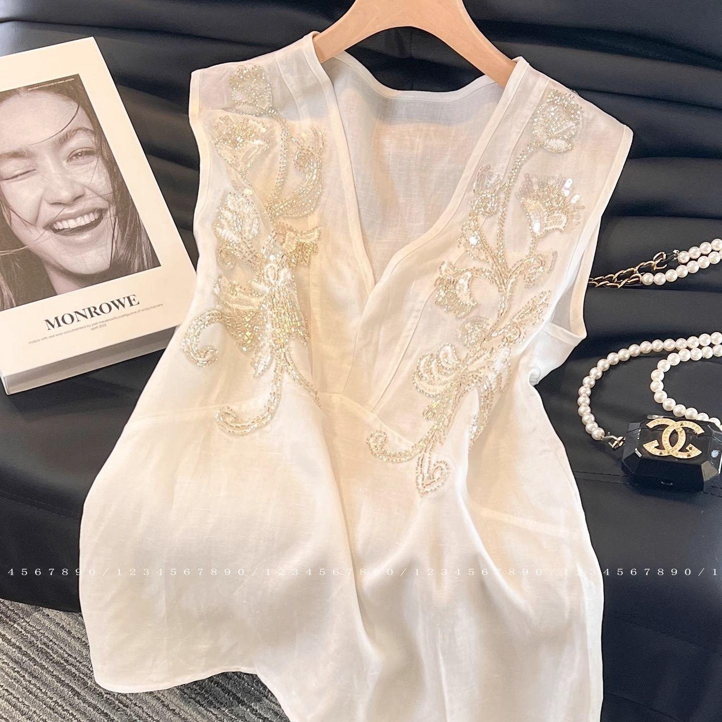 新中式潮款珠绣V领无袖小衫女夏2025新款国风高级感宽松马甲背心