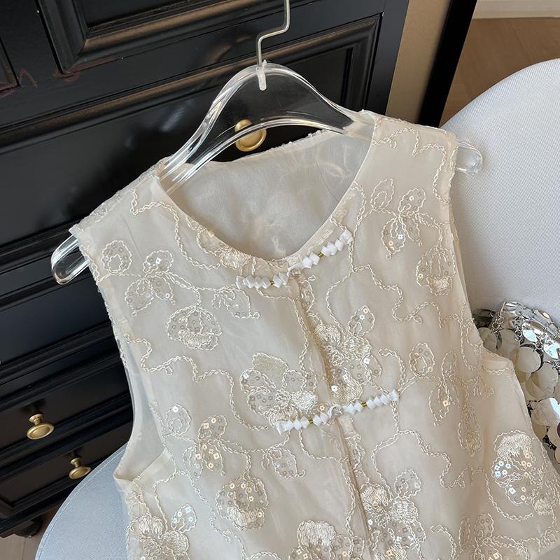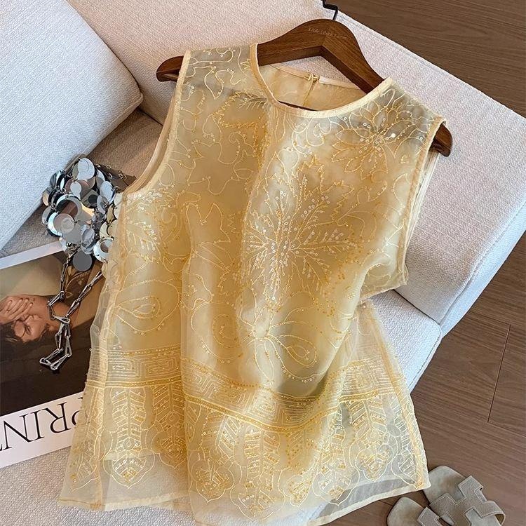 夏の新しい中国風のビーズ刺繍オーガンザラウンドネックトップ女性用、頑丈な気質とスリムなベスト