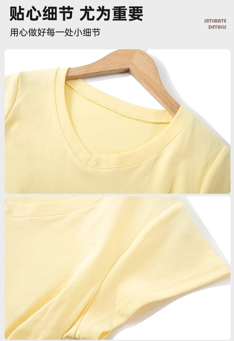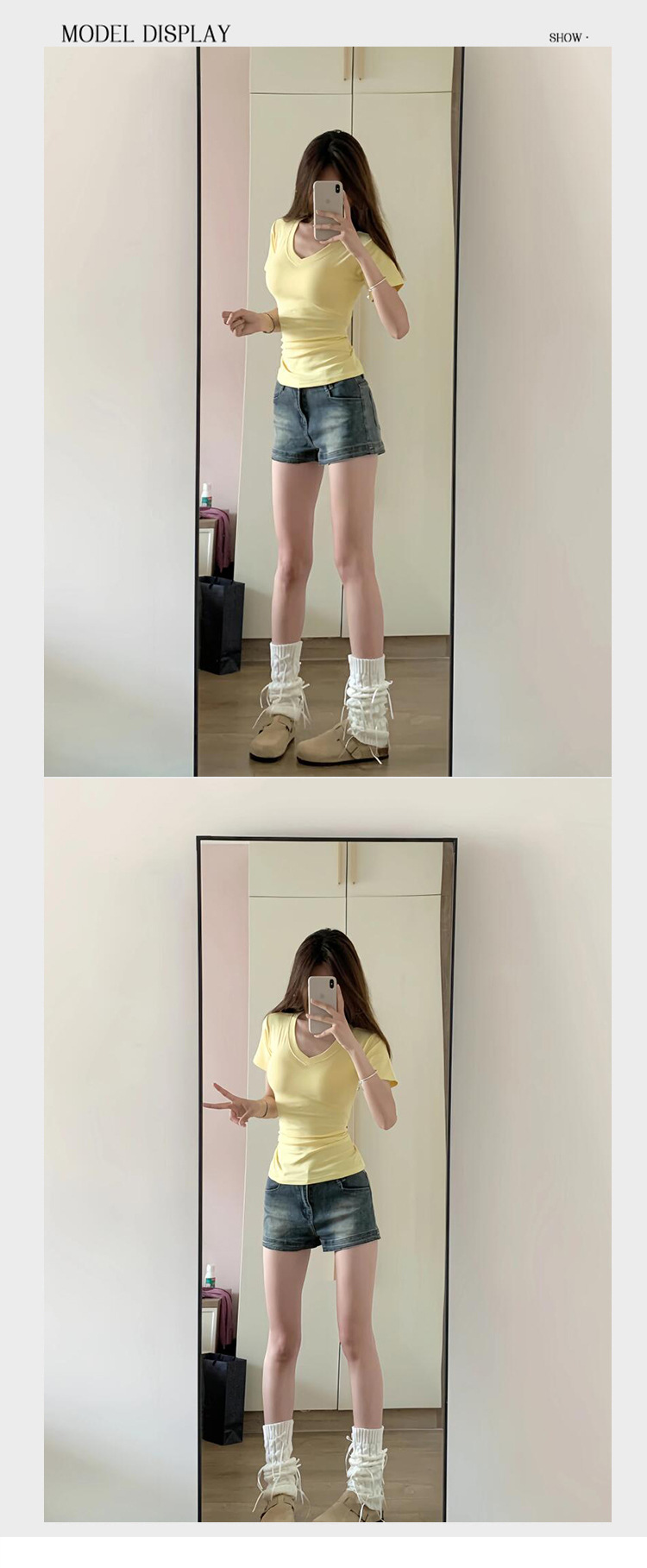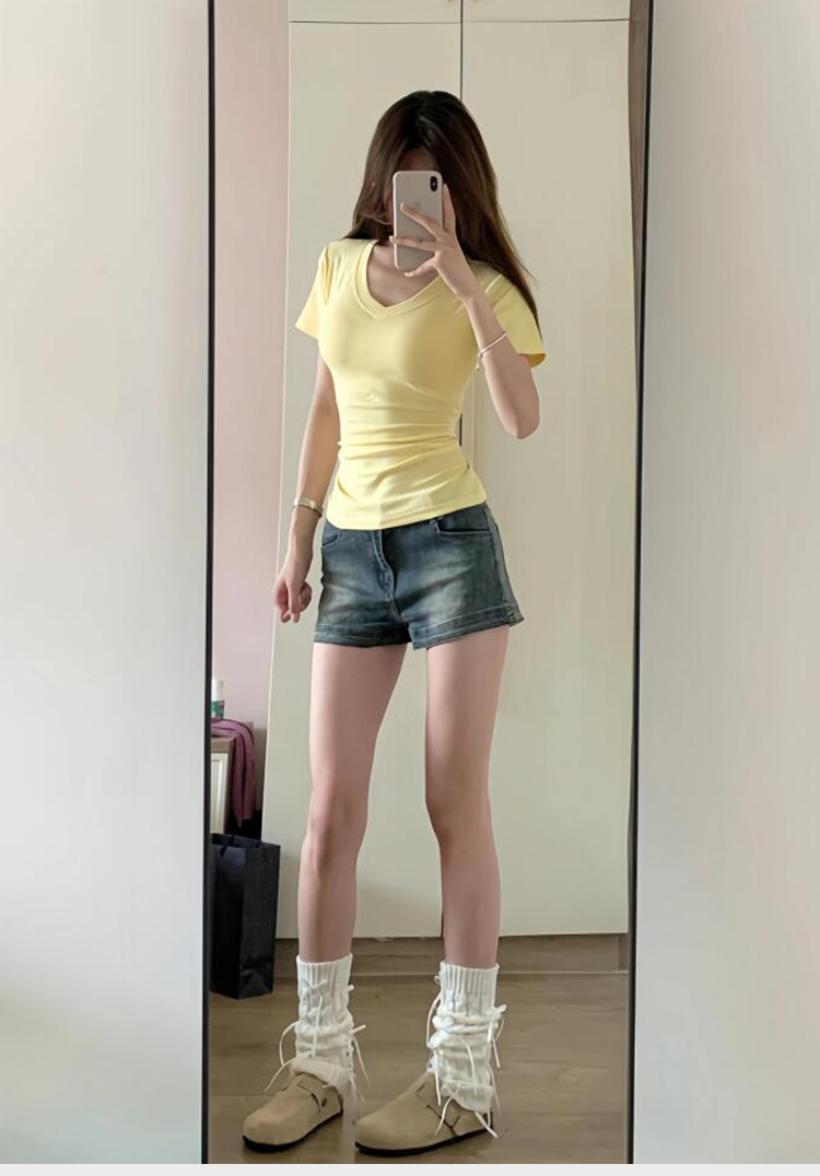 ミルクイエロー V ネック右肩スリム半袖レディース T シャツ夏タイトウエストドーパミンウェアトップス痩身半袖