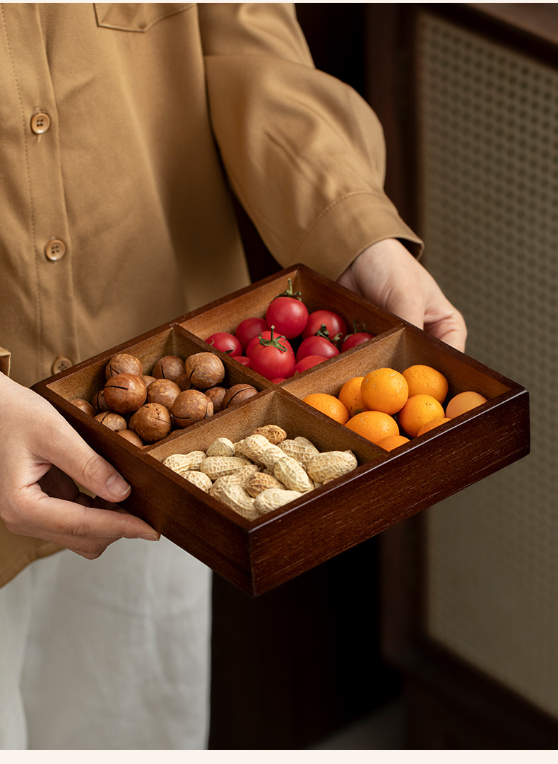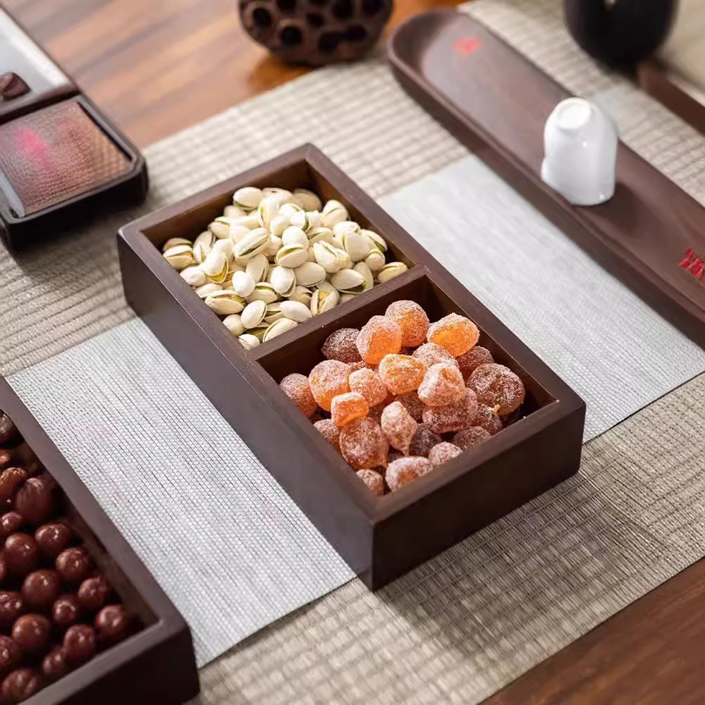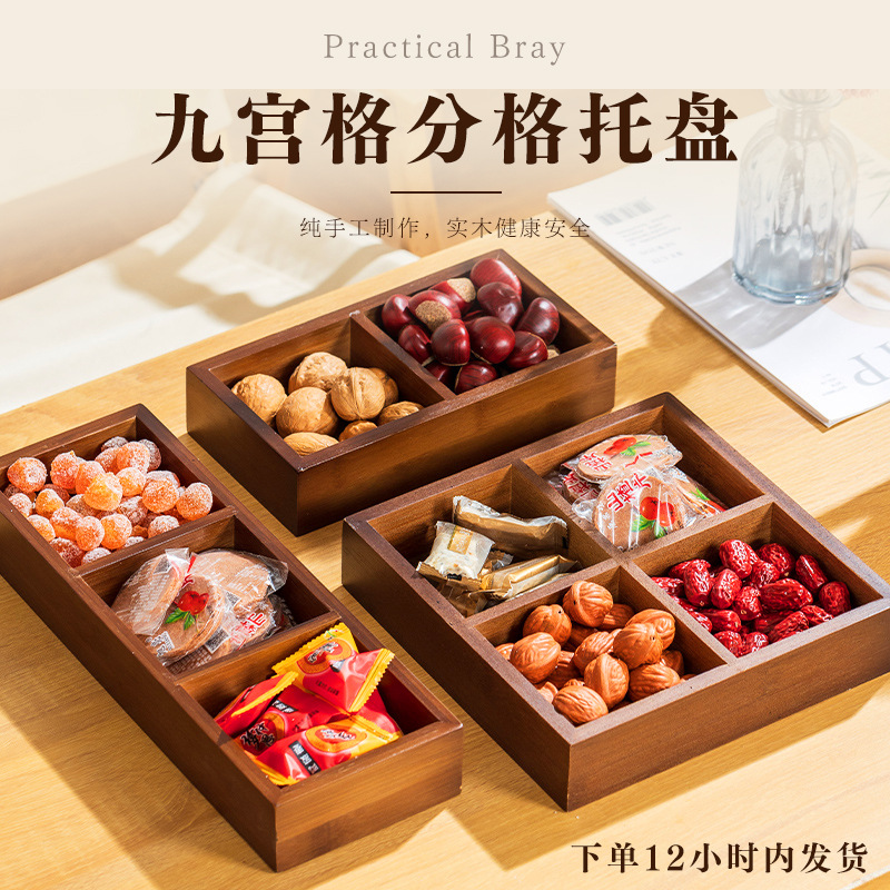 新しい中国風の高価値ウォールナット色の竹宮殿グリッドプレートティーディッシュ分割デザートキャンディスナックナッツドライフルーツプレート