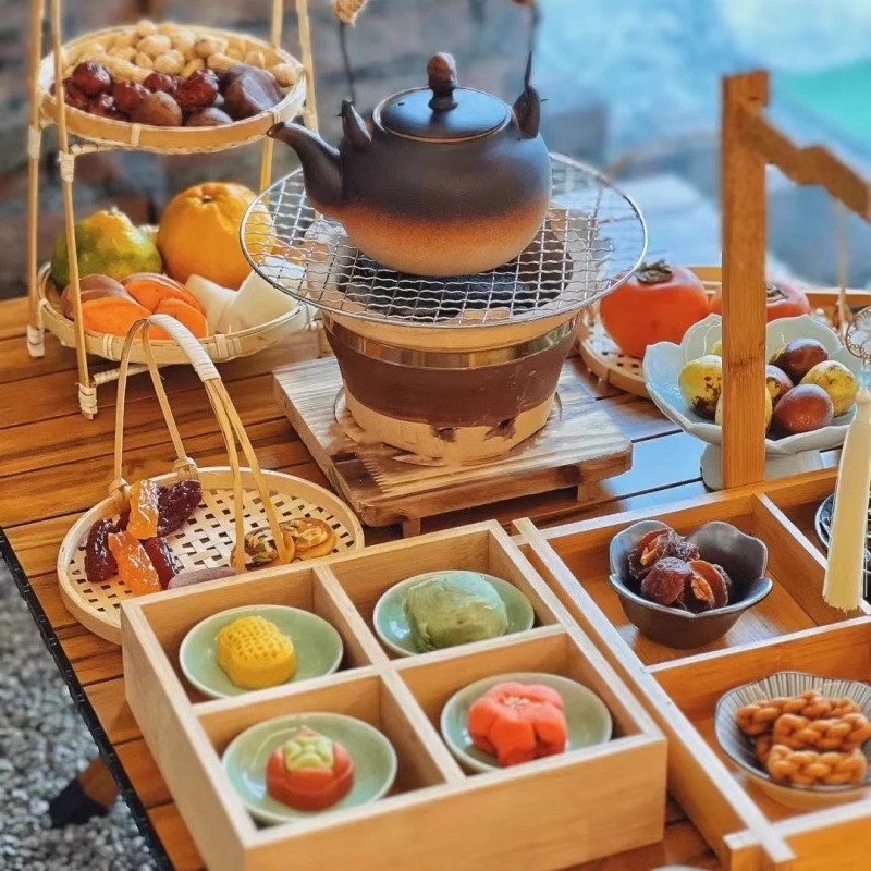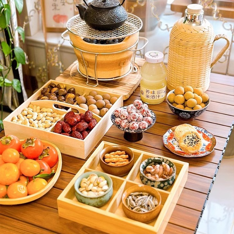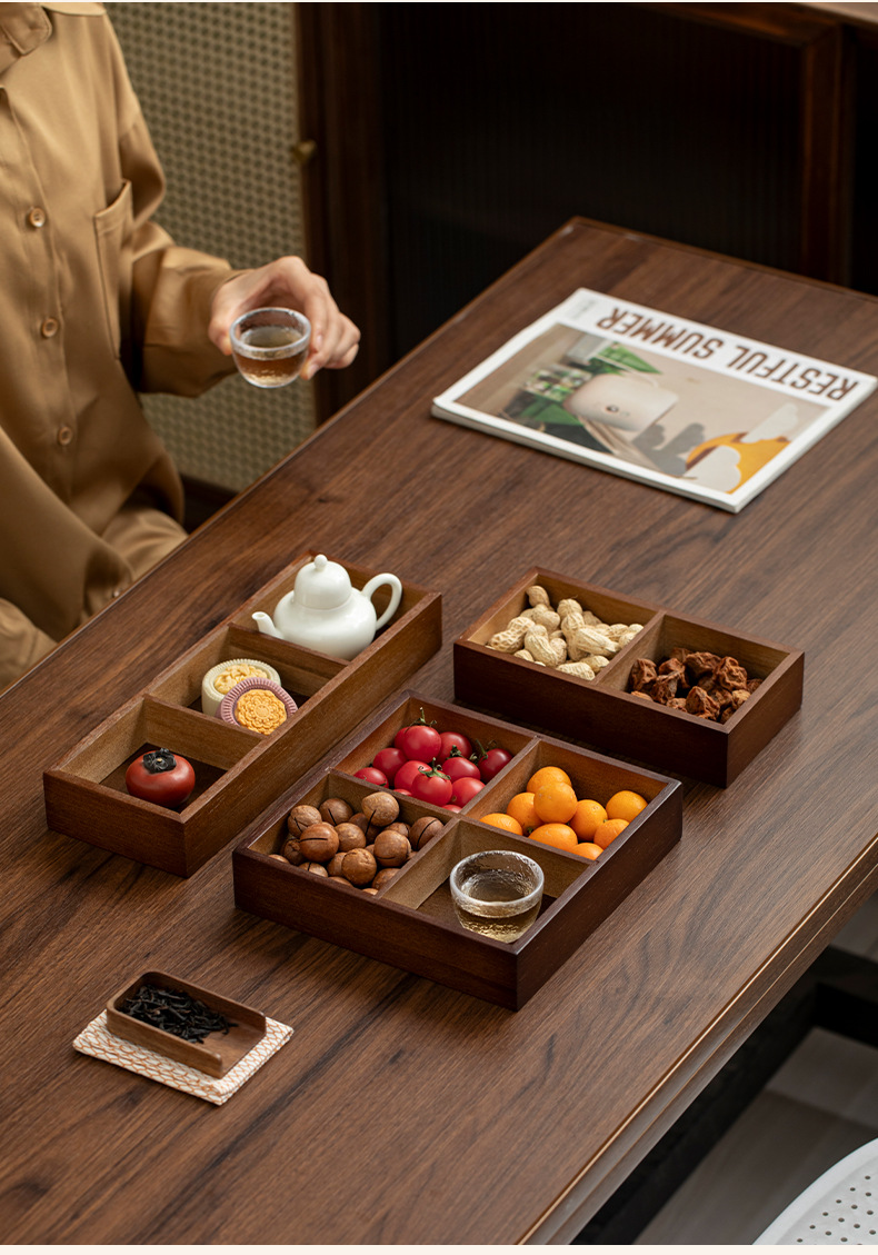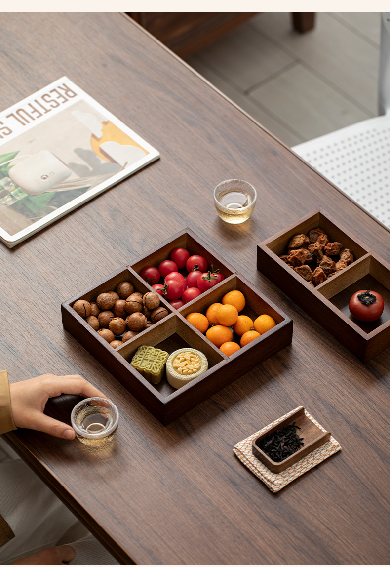 2025新型囲炉裏煮茶トレー四宮格木質九宮格乾果皿果物皿お菓子皿