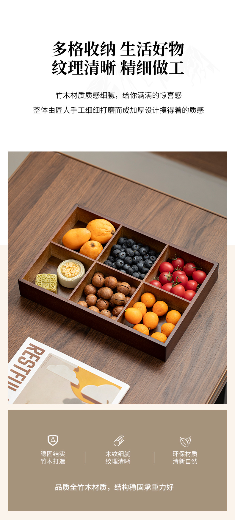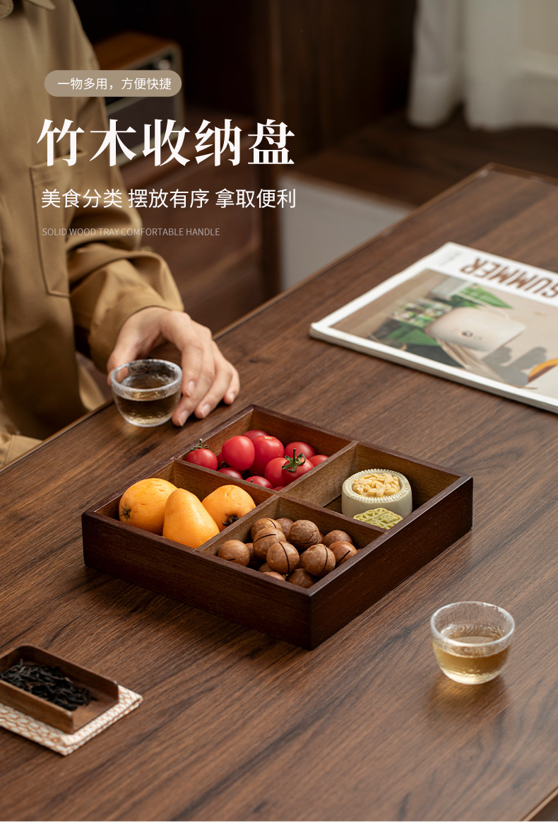 轻奢竹制宫格带盖果盘精致家用茶几摆放水果盘分格点心糖果盒