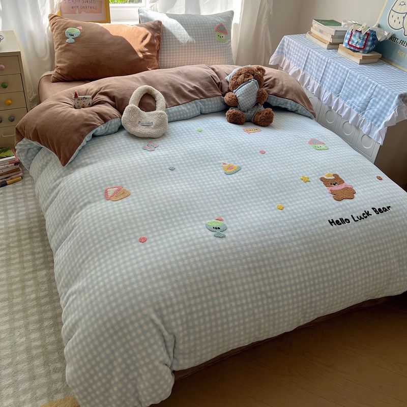 卡通牛奶绒四件套毛巾绣冬季加厚珊瑚绒床单被罩宿舍三件套不掉毛