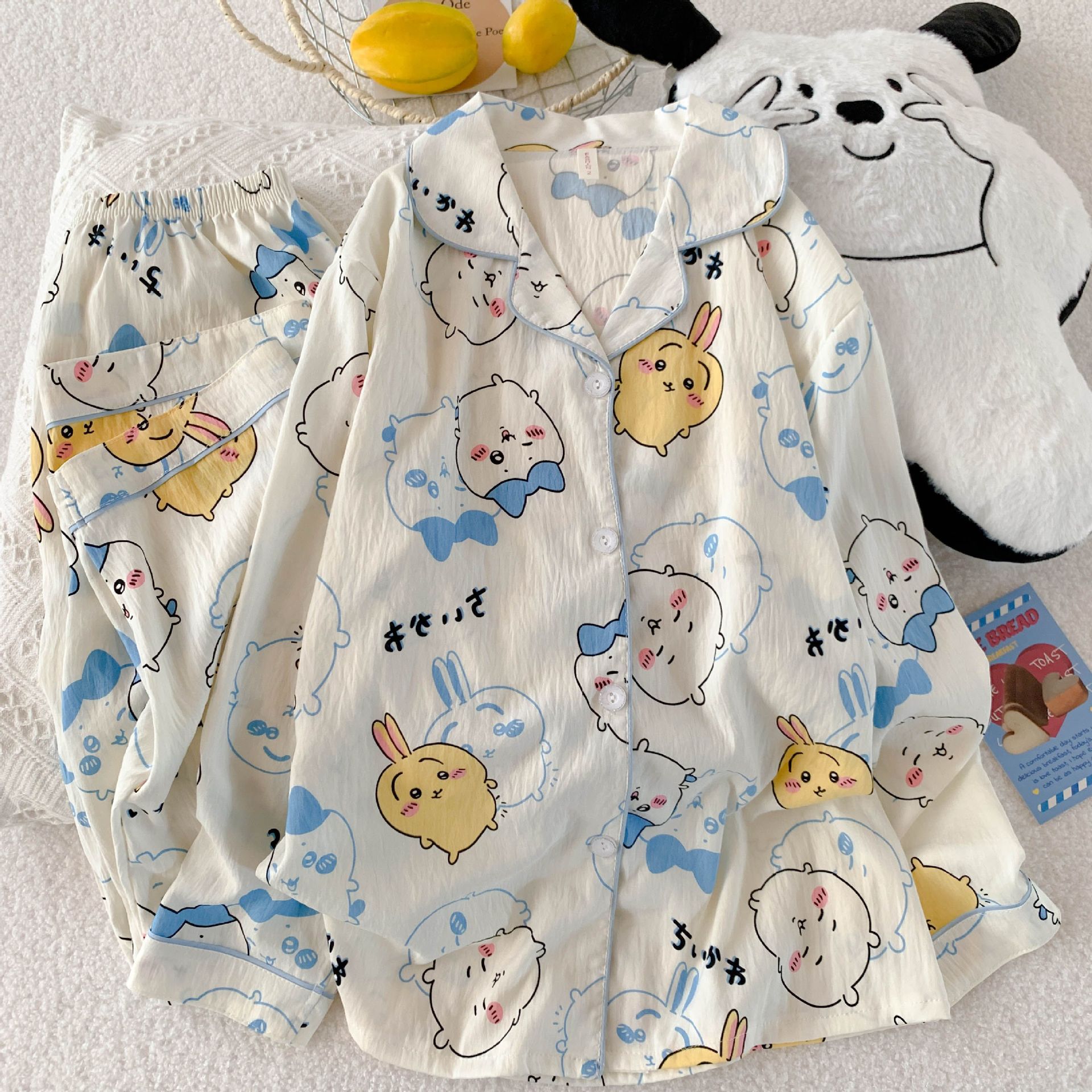 女性用クロスボーダー卸売クラウドコットンパジャマ、秋の漫画風キュートな長袖長ズボン、漫画風カーディガン、ラペル付きホームウェアセット