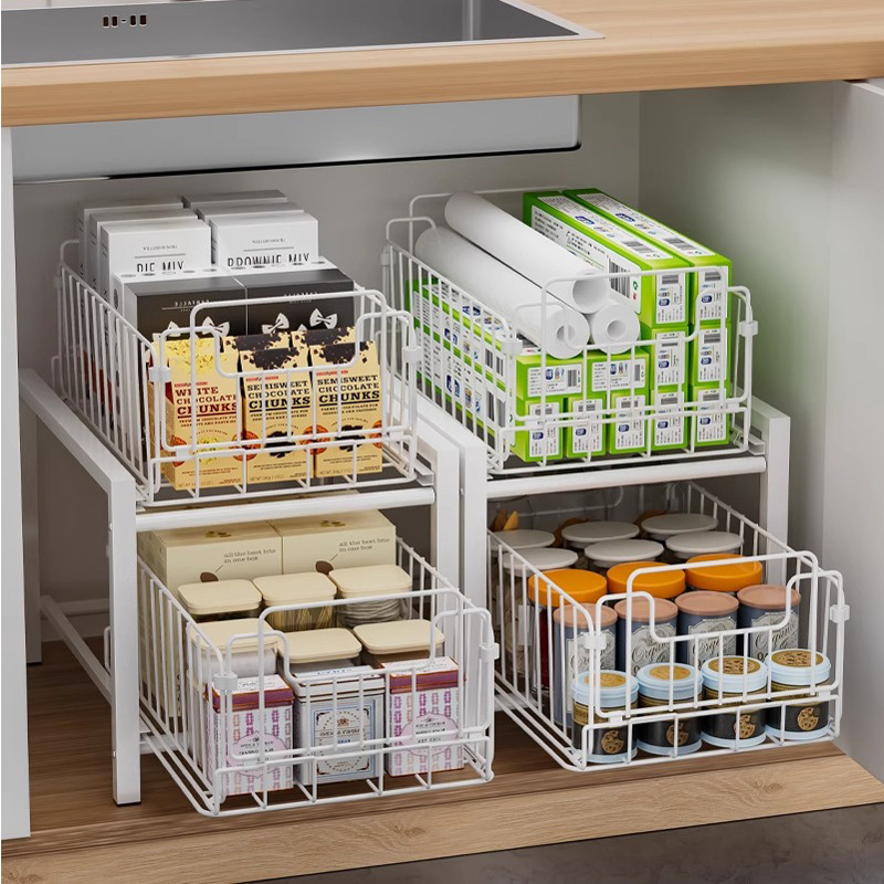 キッチンシンク下収納ラック、多機能引き出し式収納ラック、調味料ボウルとディッシュバスケット、取り付け不要のキャビネット層状ラック
