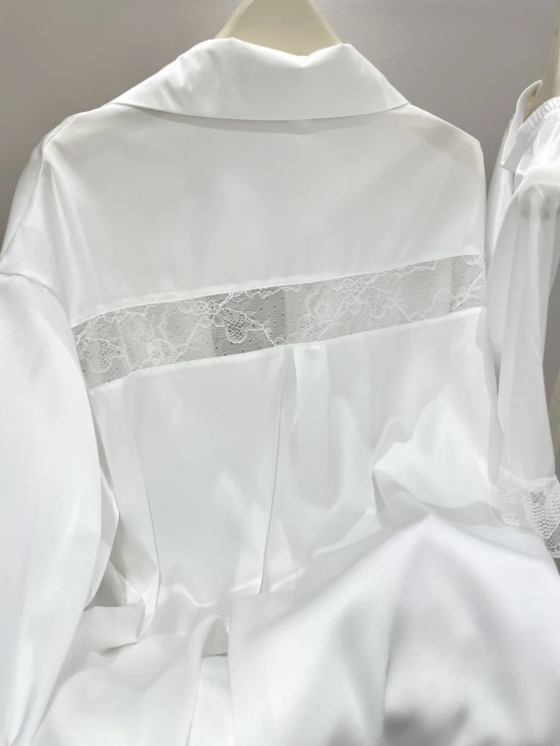 〈白い恋人〉シンプルスタイル白フェイクツーピースレースパッチワークシャツショーツホームウェア2点セット