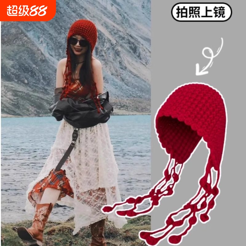 川西旅游镂空针织帽子女出游百搭流苏绑带安可雷穿搭毛线套头冷帽