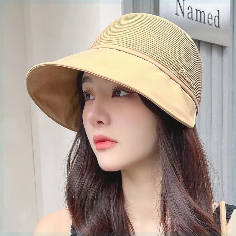 夏の日よけ帽子、大きなつばの日よけフィッシャーマンハット、女性用、おしゃれな韓国風、文字とストライプ、黒のUVカット帽子