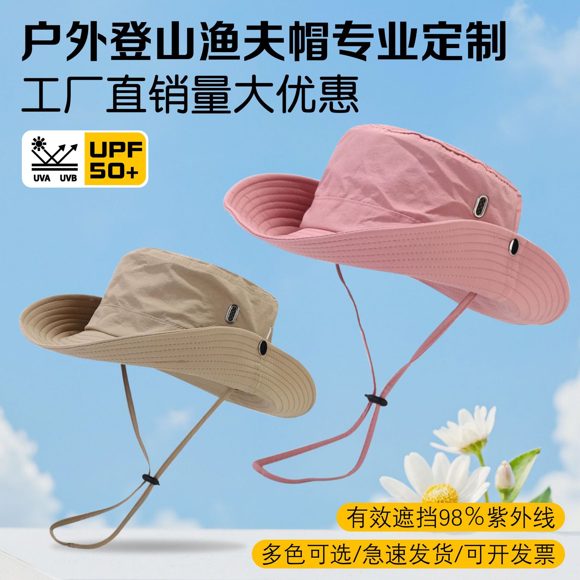 防晒太阳帽户外钓鱼登山帽西部牛仔帽女抽绳渔夫帽大帽檐夏季度假