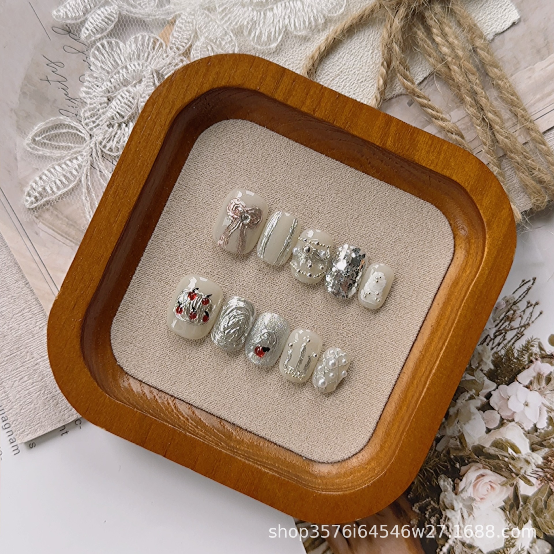 原创手工穿戴甲批发轻奢重工手绘蝴蝶结 手捏造型可爱美甲成品