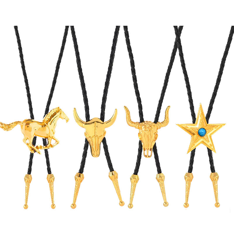 欧美跨境金色牛头五角星合金bolo tie领绳风配饰西部牛仔皮质项链