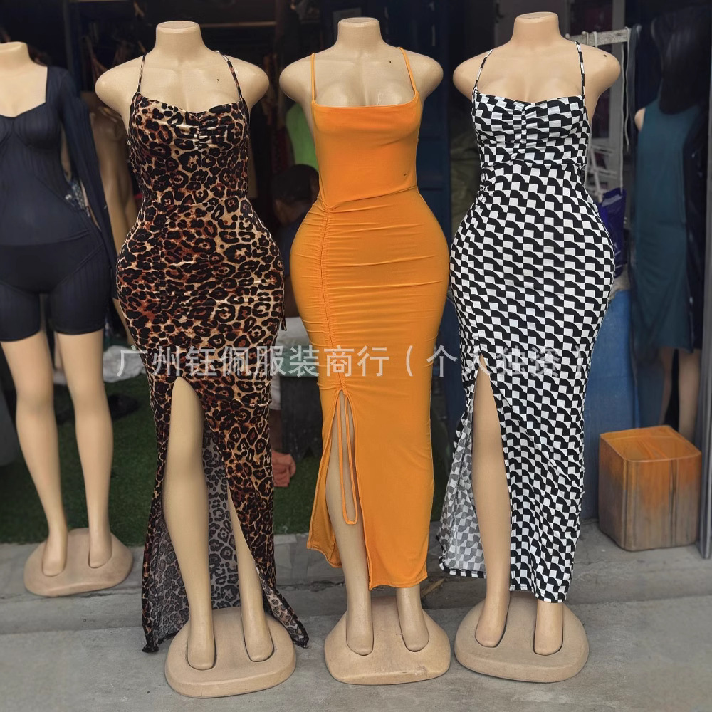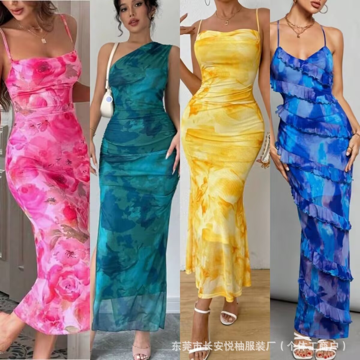 亚马逊欧美外贸吊带长裙夏季女装绑带设计感紧身包臀裙混色混款批