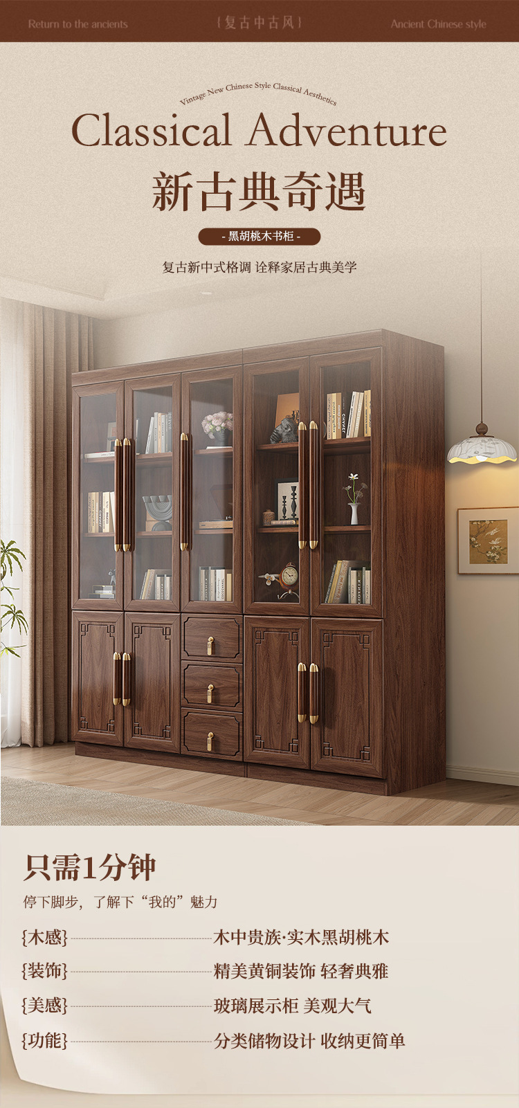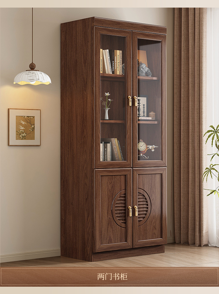新中国式実木本棚黒胡桃本棚組合せガラス棚扉付き床置き壁付き書斎家具棚
