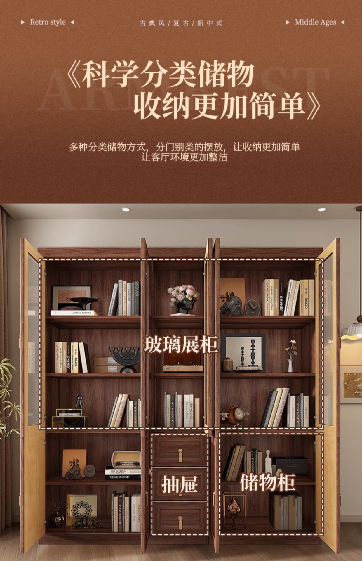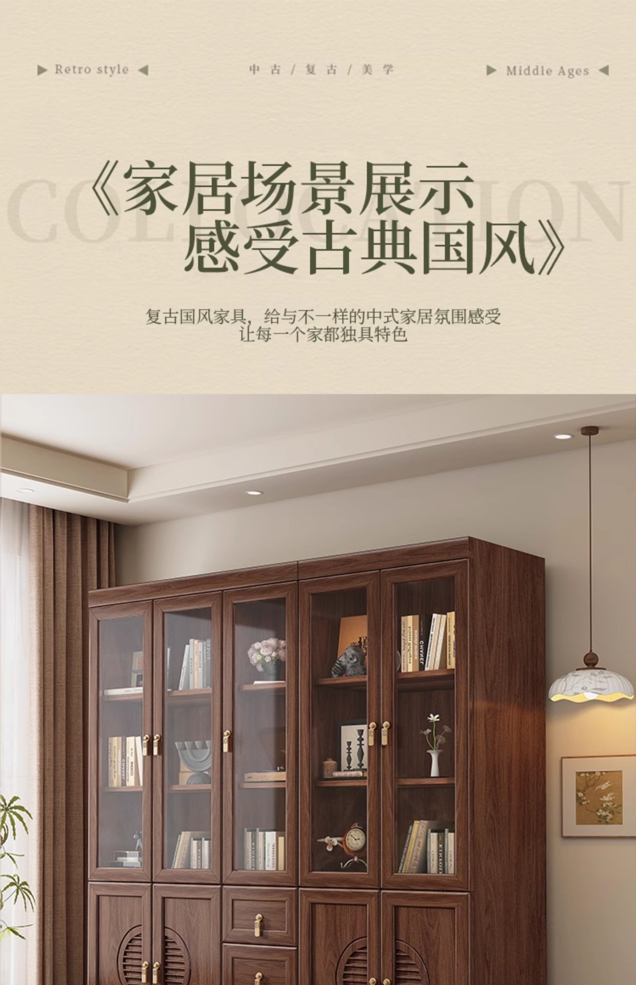 中古风实木书柜书房大组合书架黑胡桃木玻璃门一体抽屉储物置物柜