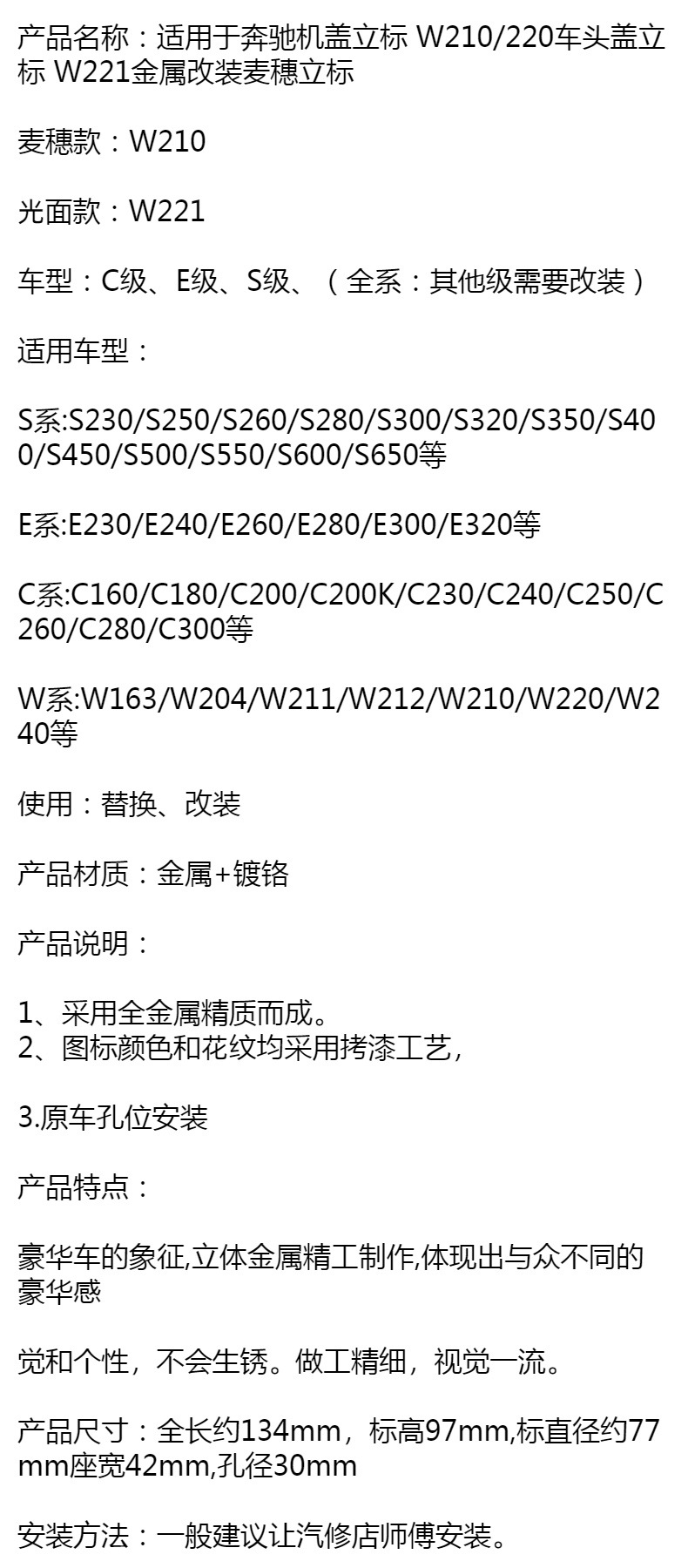 メルセデスベンツフードスタンドW210/220フロントフードスタンドW221金属修正フードスタンドに適しています。