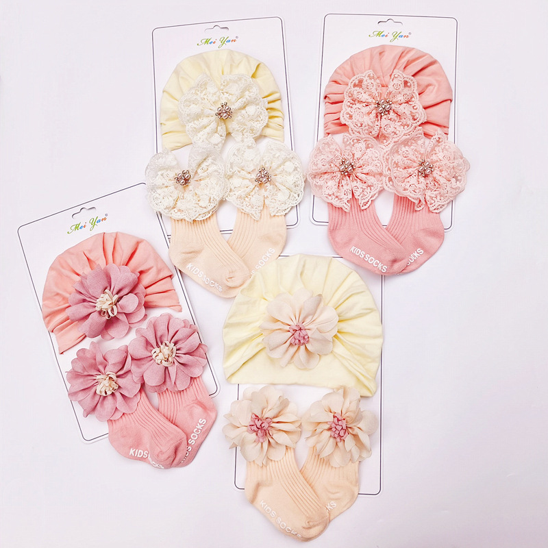 赤ちゃんの帽子の靴下のセットの女性の赤ちゃんの洋気レースの王女の頭の帽子の新生児の保護の帽子のインド