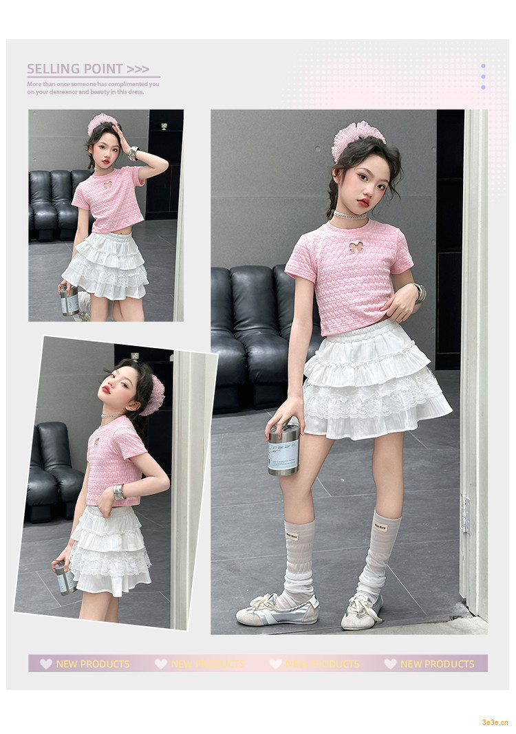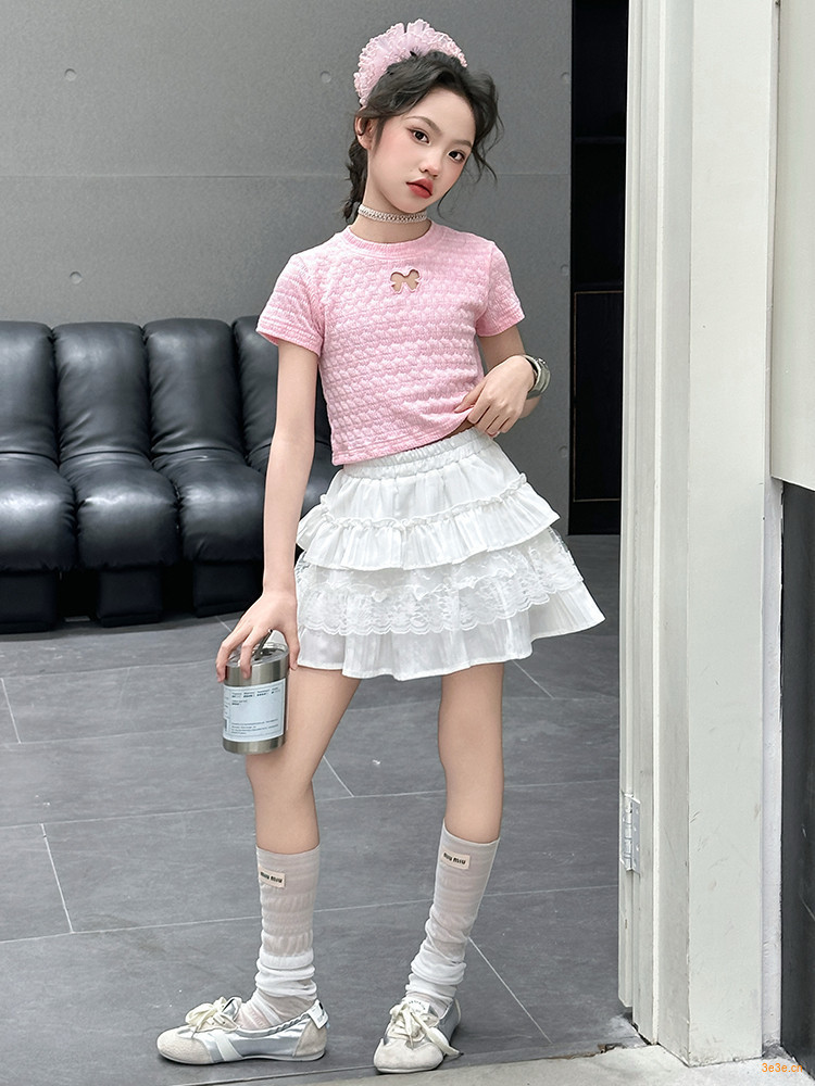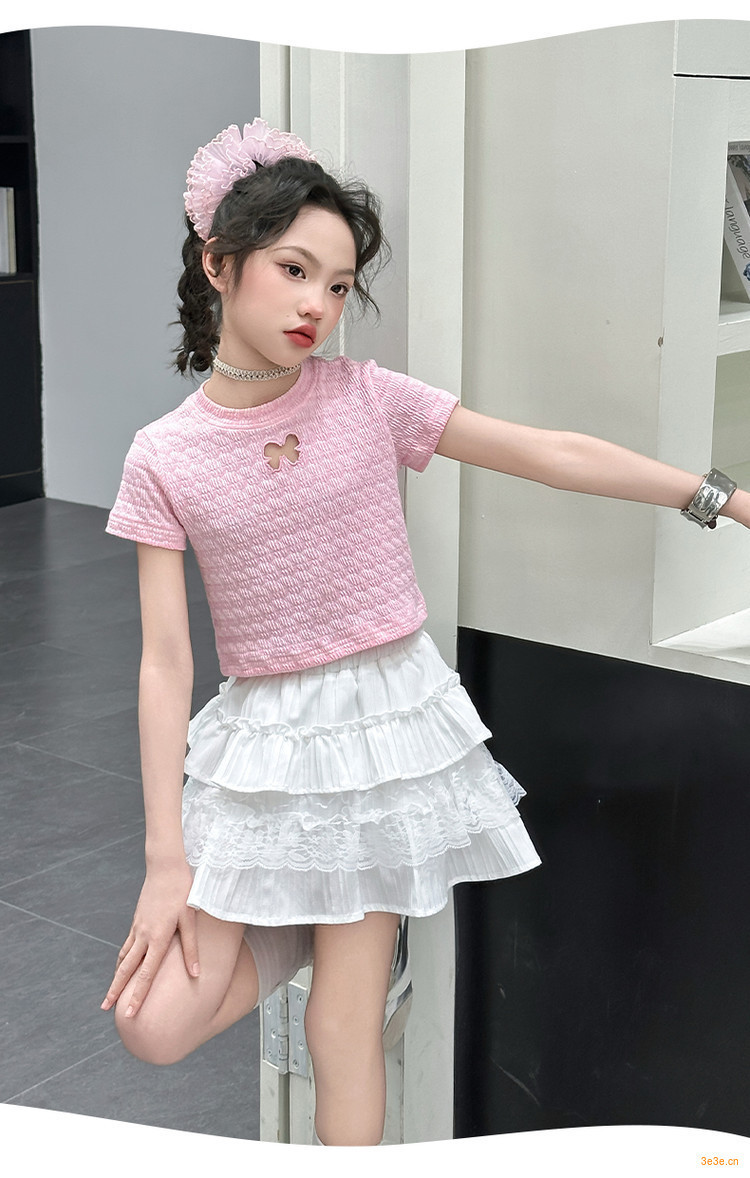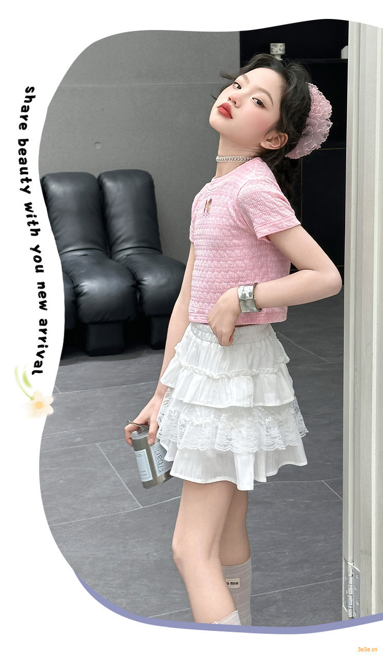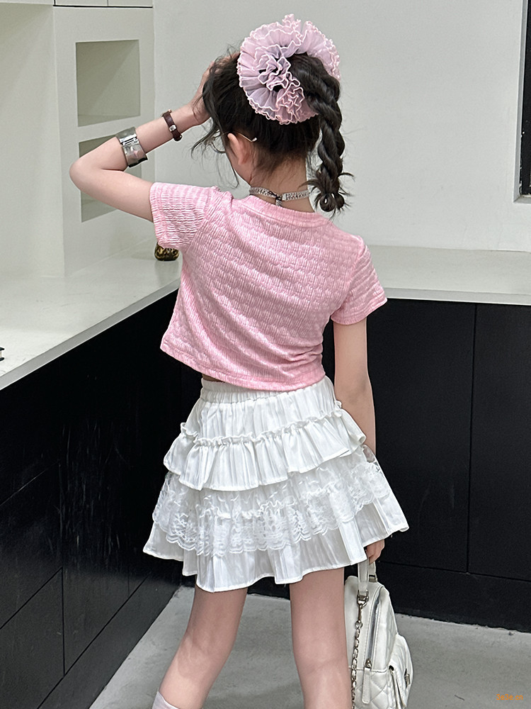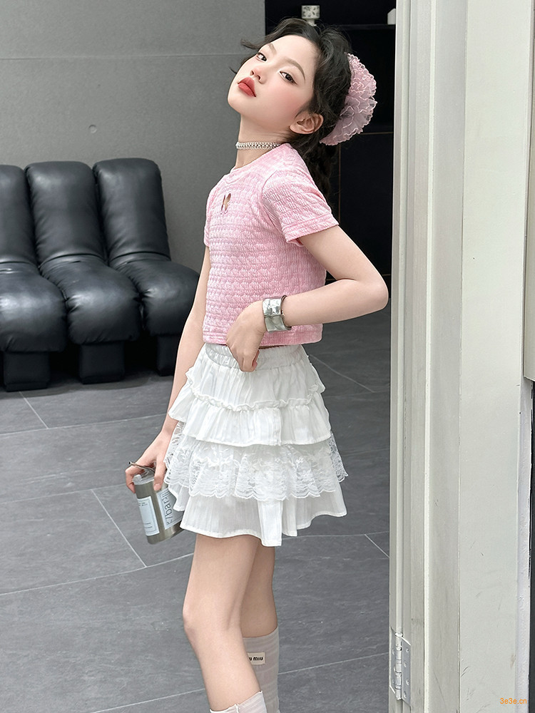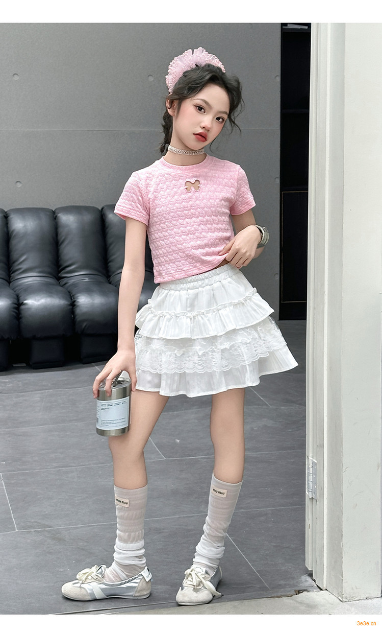ピンクのTシャツ,白いスカート