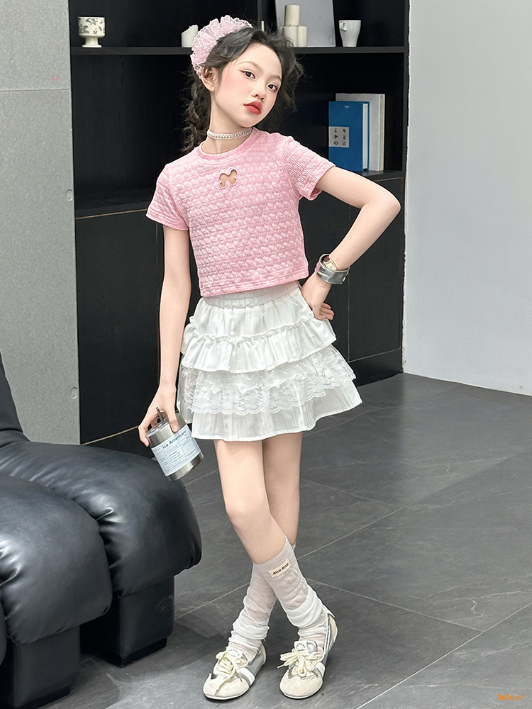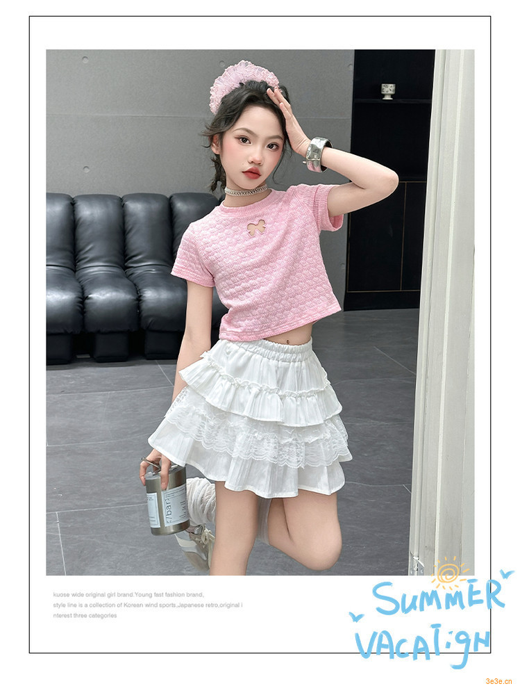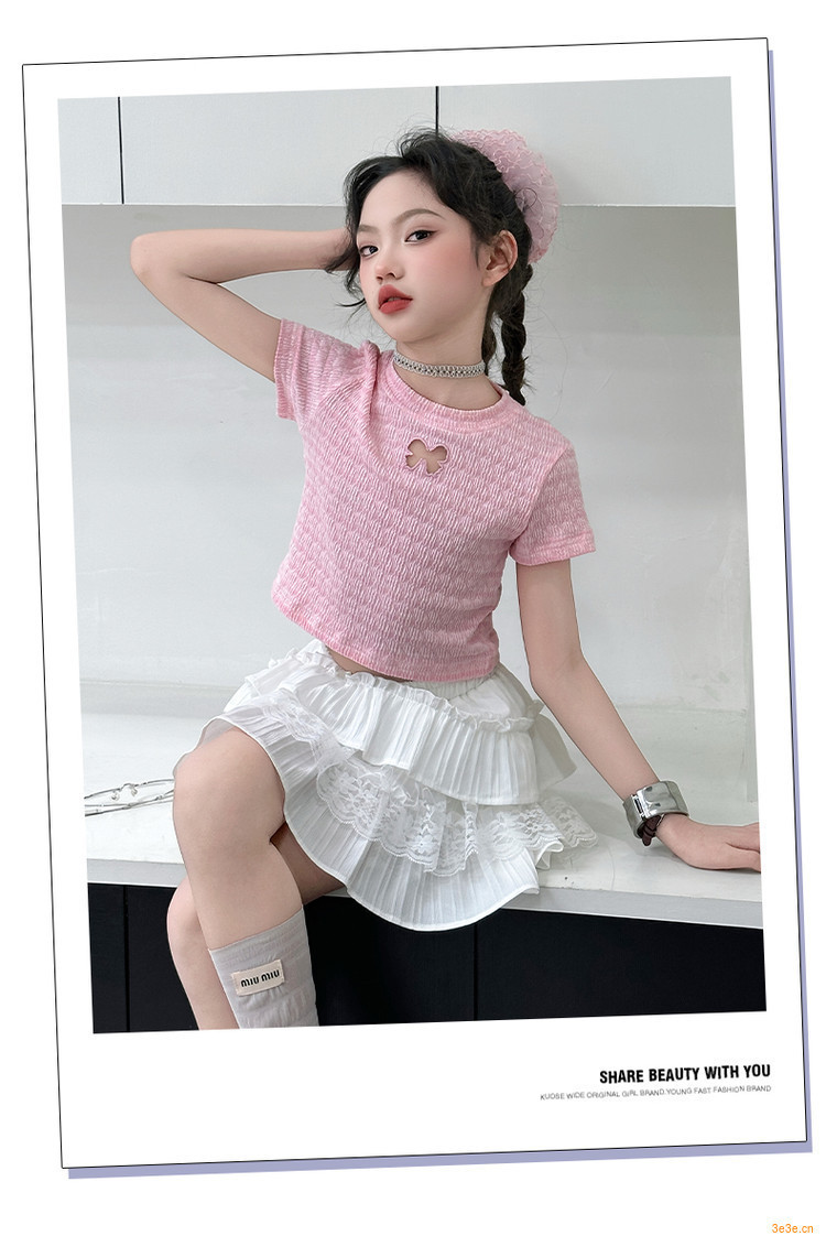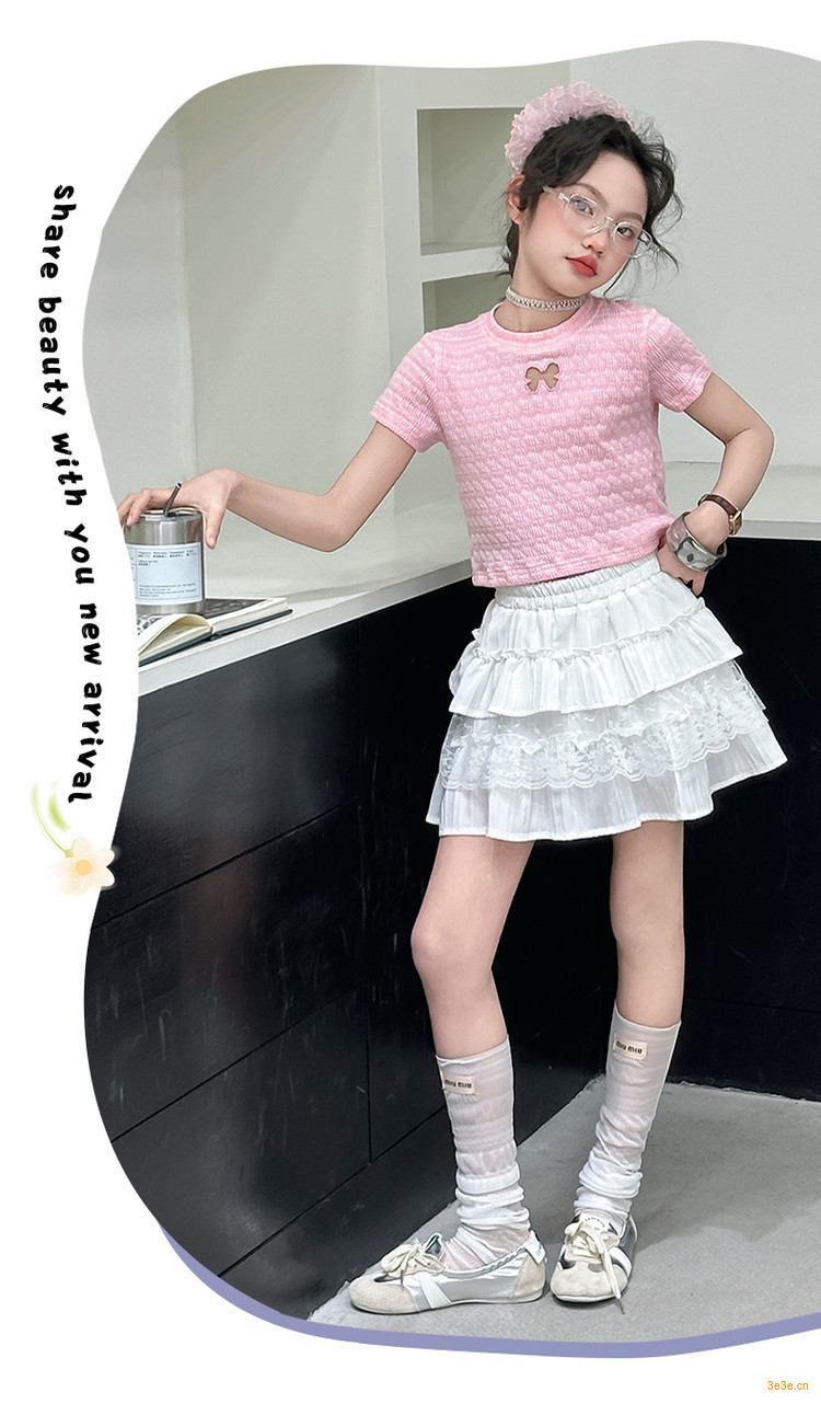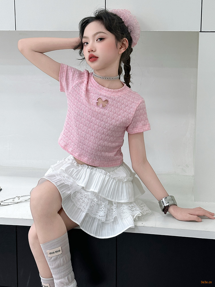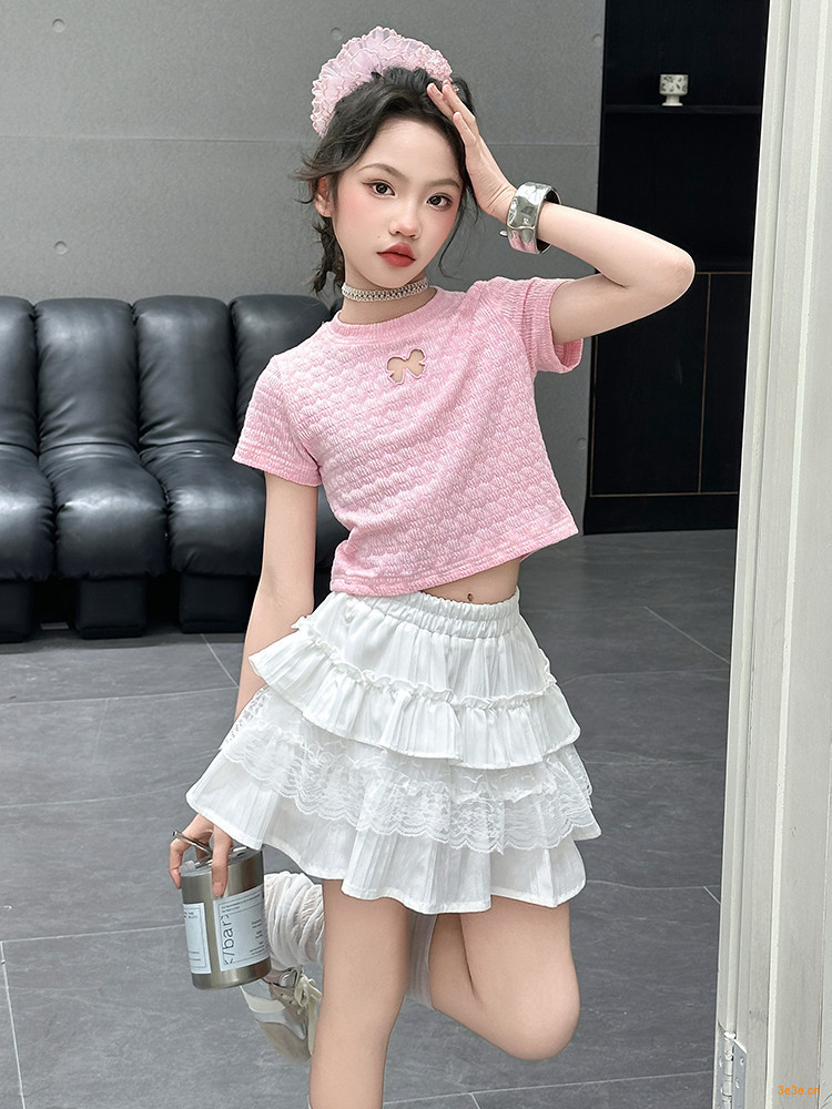 ピンクのTシャツ,白いスカート