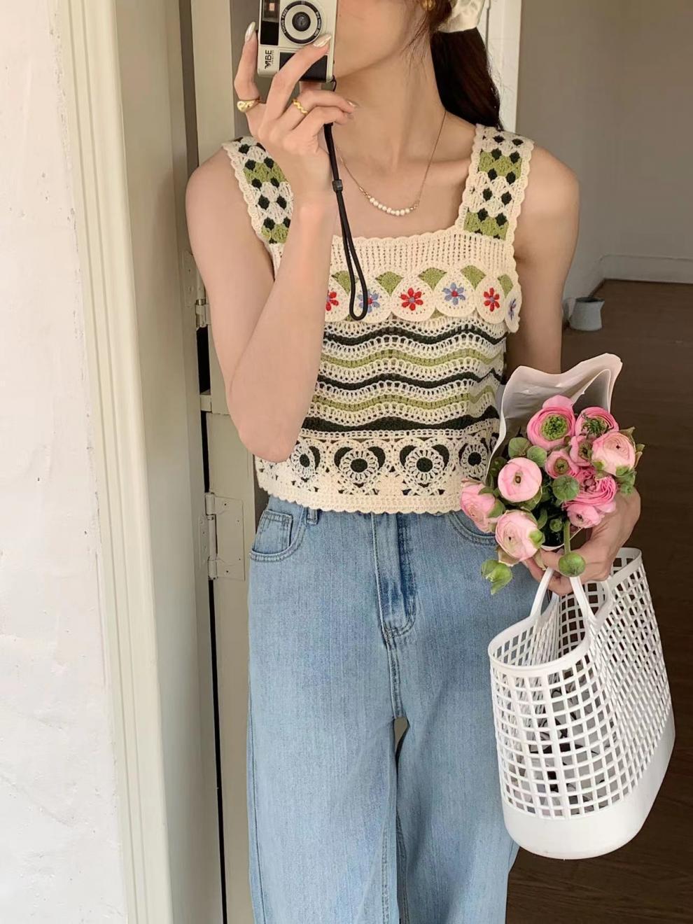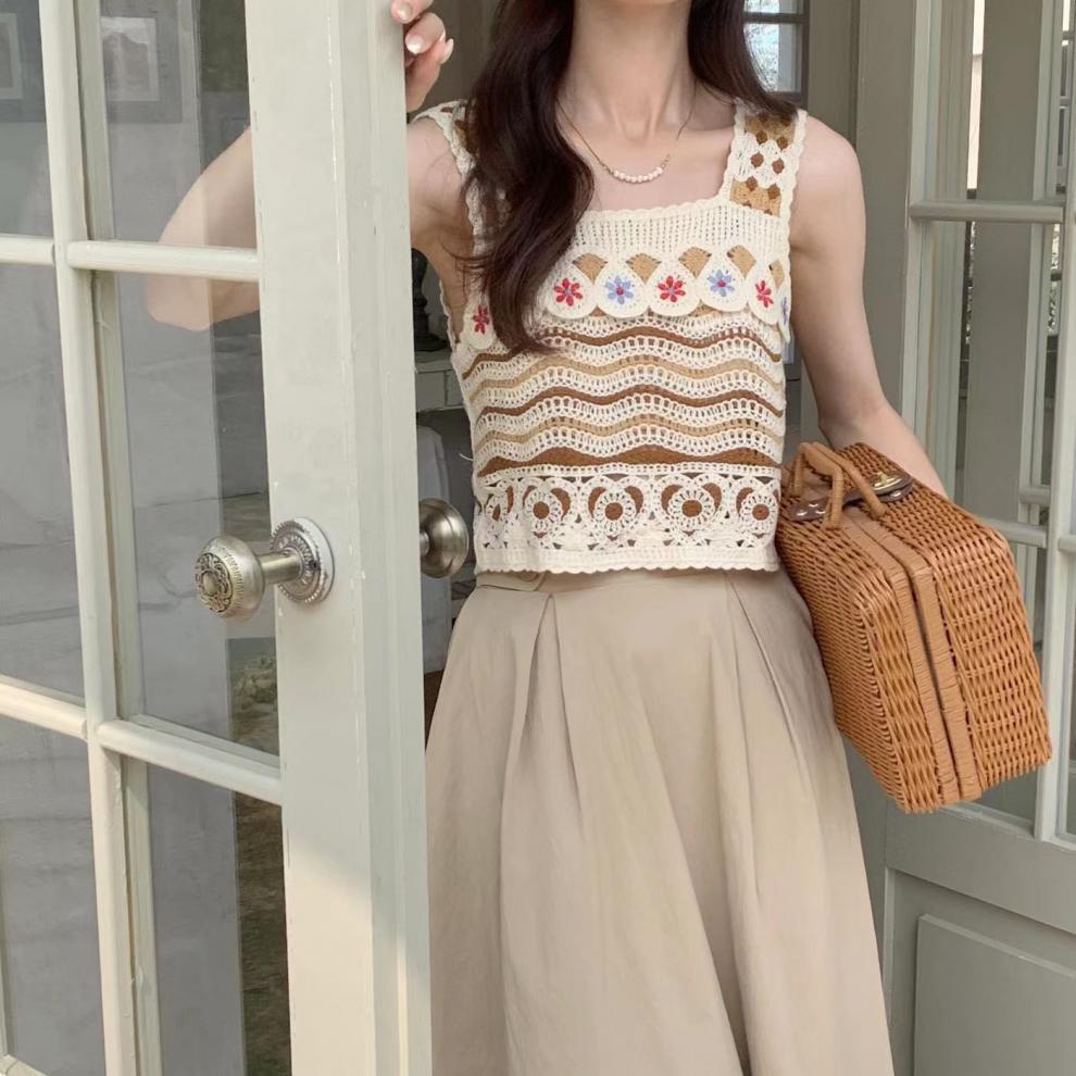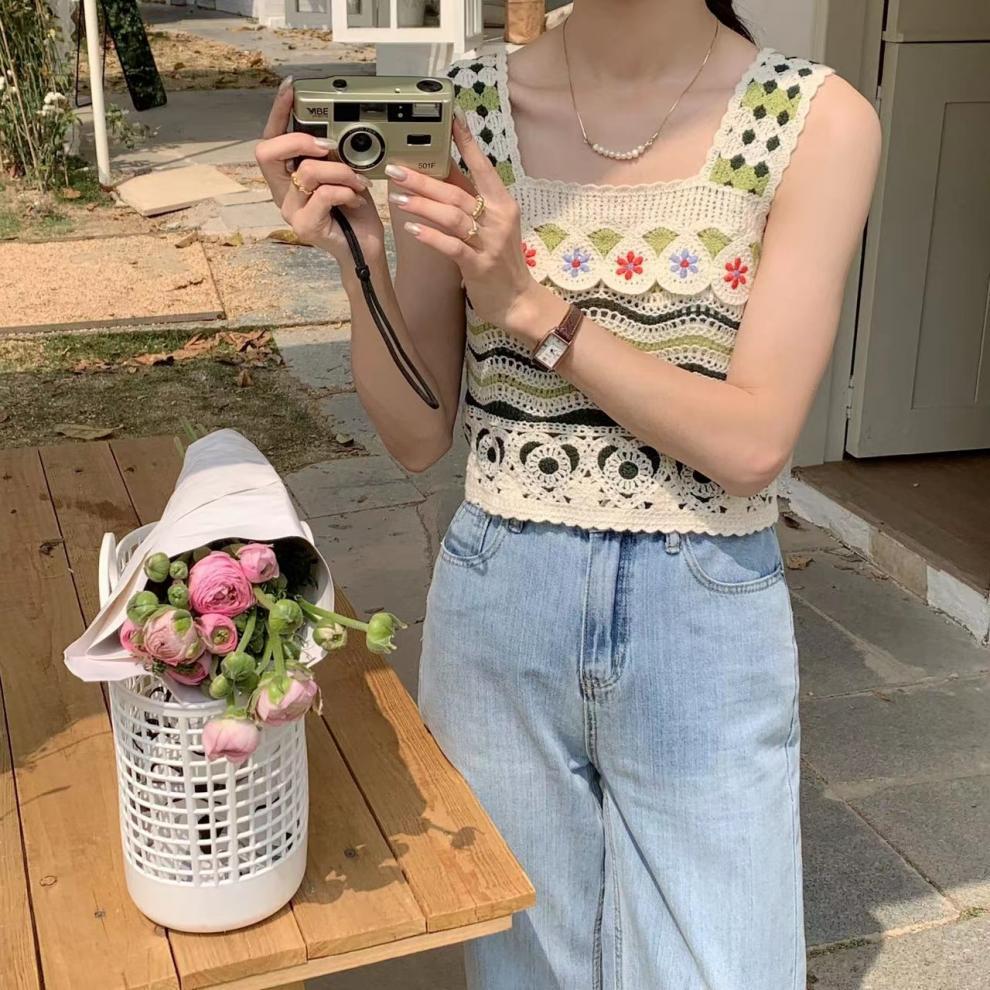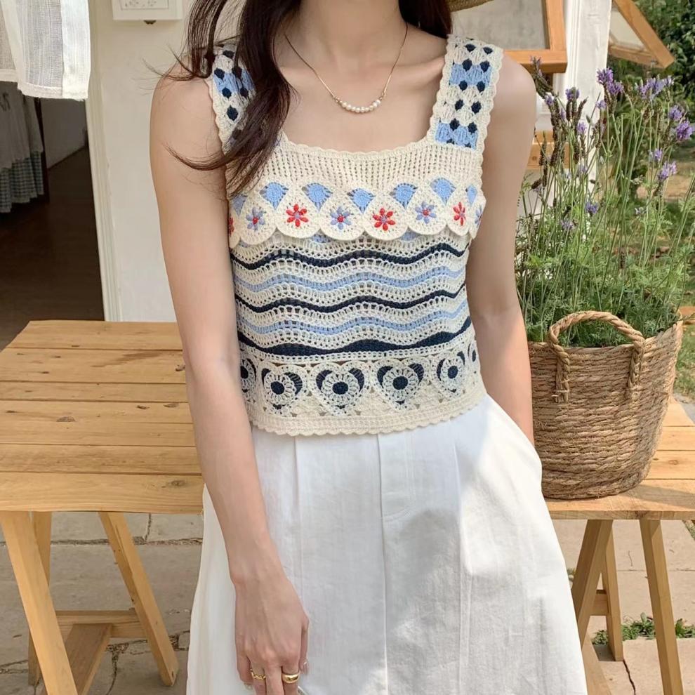 フレンチレトロな小さなキャミソール中空かぎ針編みエスニックスタイルニットベスト女性の夏の海辺の休暇アウタートップ