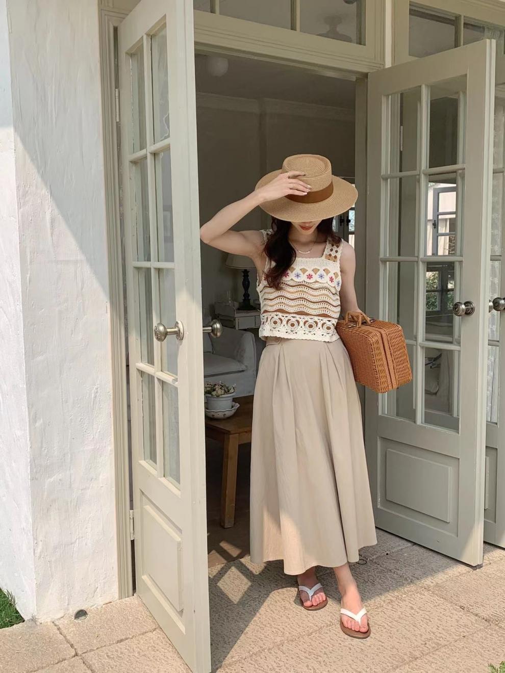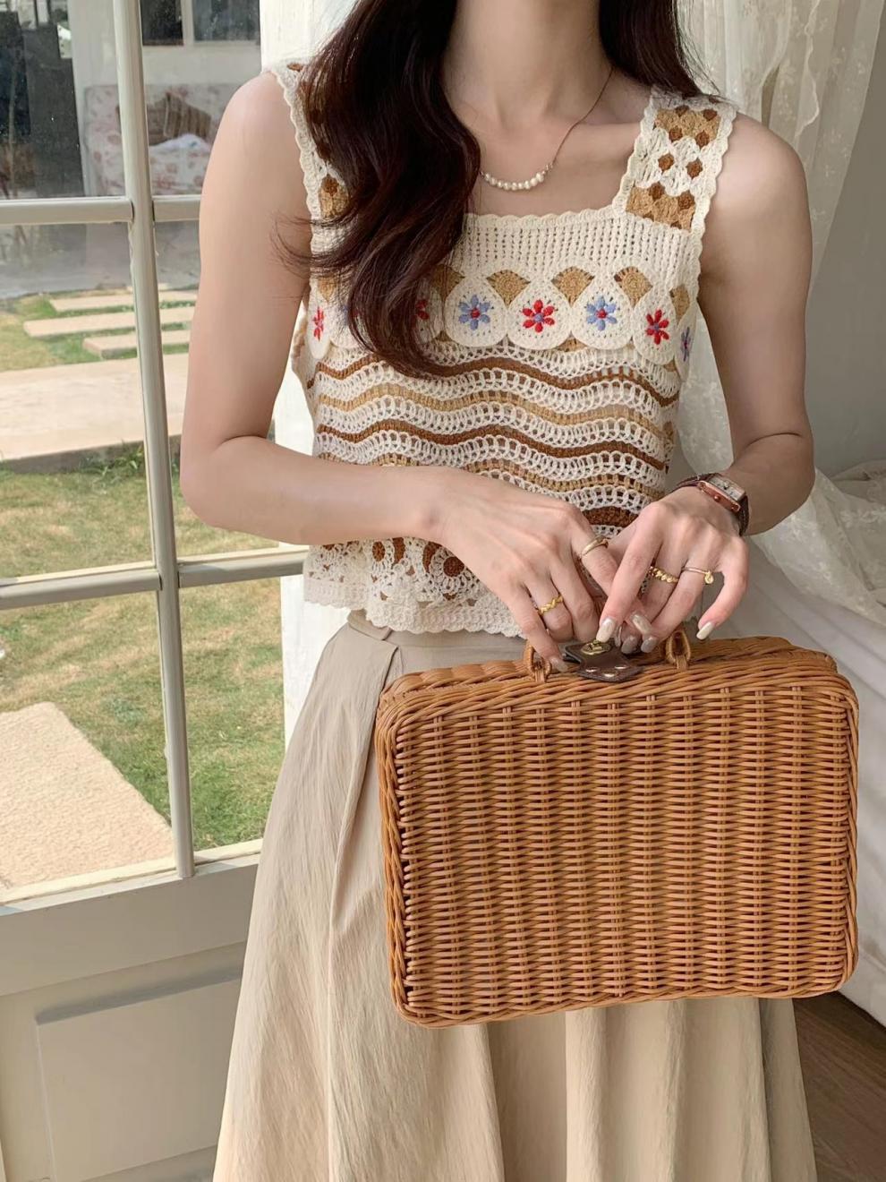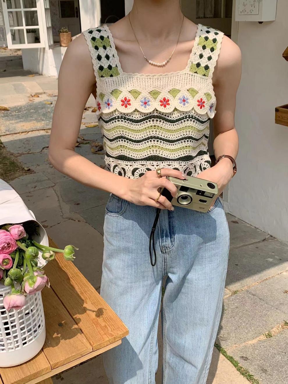 フレンチレトロな小さなキャミソール中空かぎ針編みエスニックスタイルニットベスト女性の夏の海辺の休暇アウタートップ