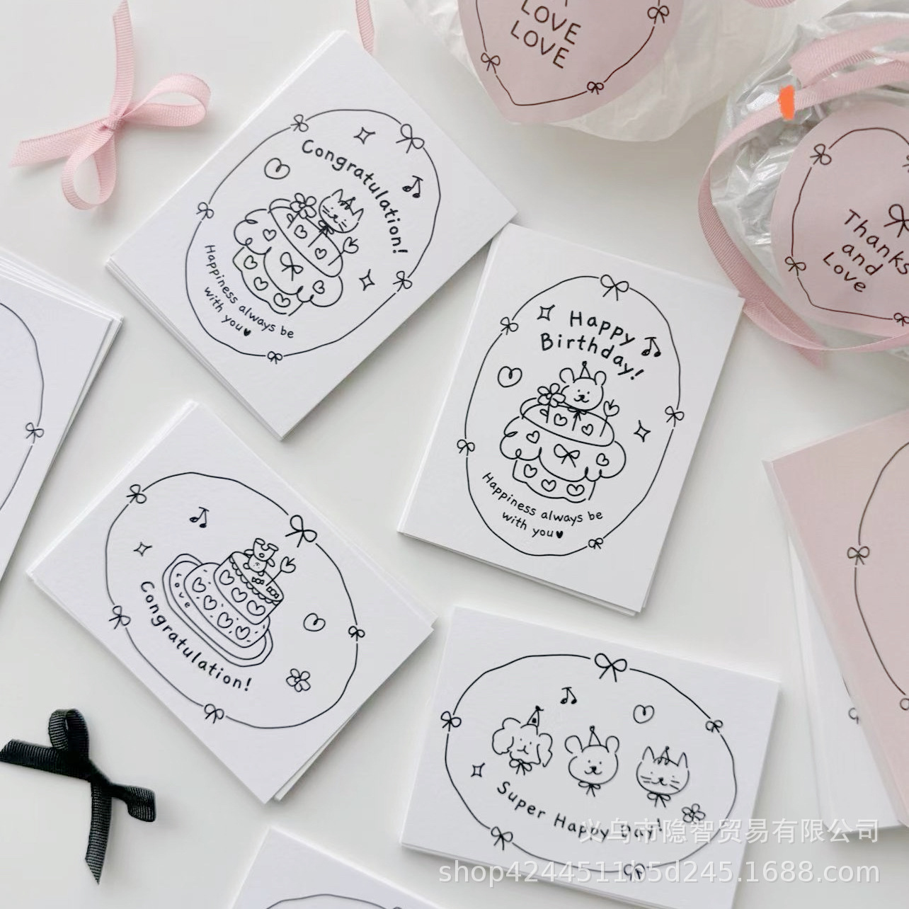 かわいい愛白黒誕生日おめでとうカード手描き子猫ケーキ花カードクリエイティブギフト伝言カード
