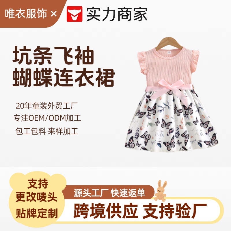 Shopify越境販売 欧米風女の子用ラウンドネックフリル袖リブ編みプリンセスドレス 蝶柄ワンピース+ベルト 子供服