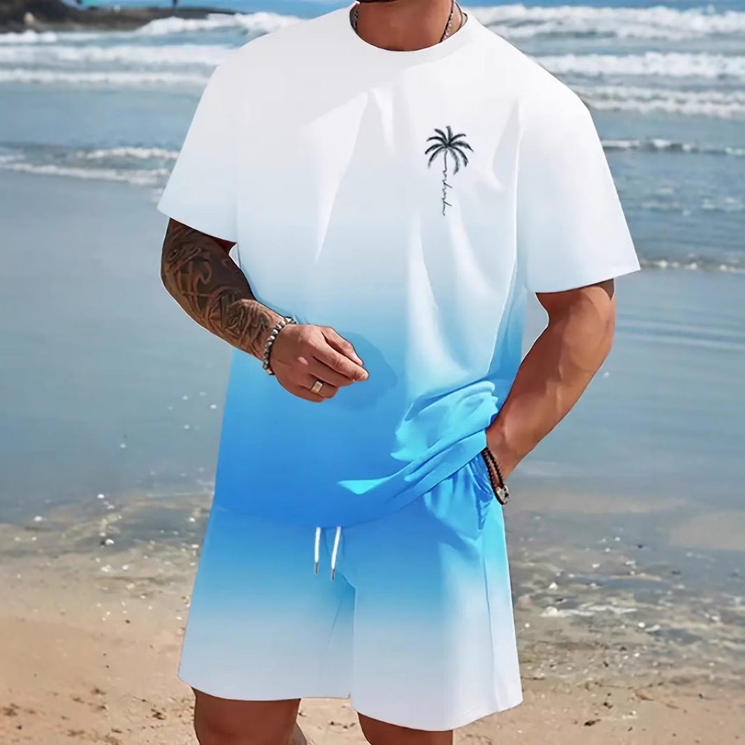 TEMU夏季3D印花T恤短裤两件套装男士 渐变 椰子树图案休闲潮流
