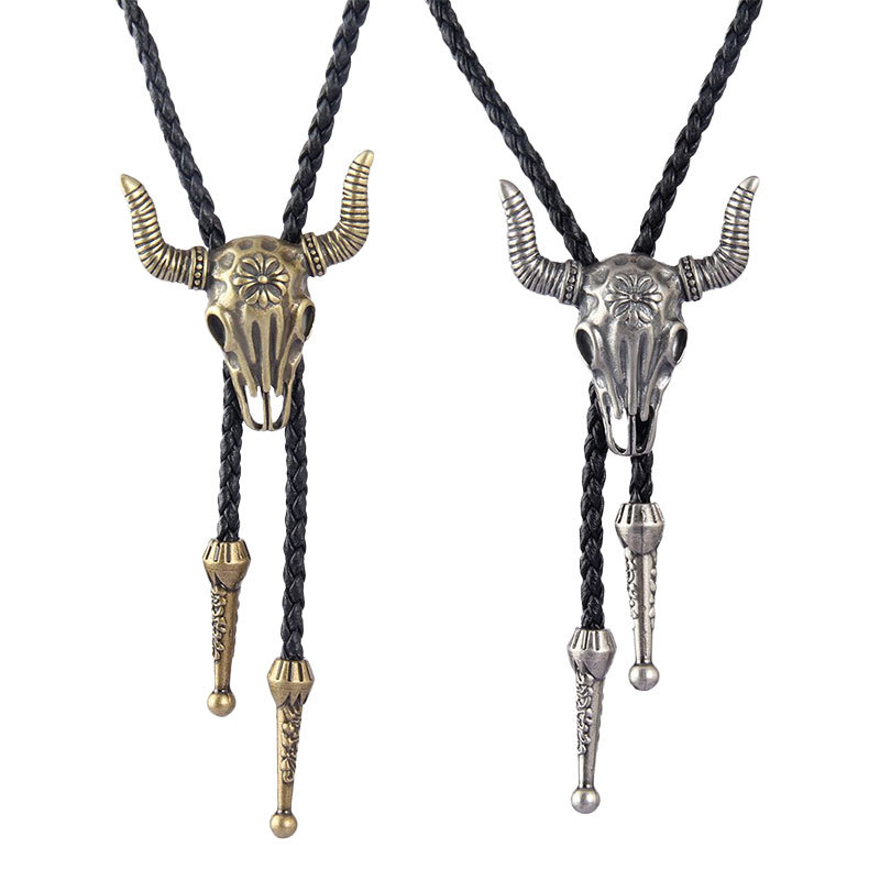 ヨーロッパとアメリカのクロスボーダーロングレザー合金牛頭ネックレスジュエリーファッションユニセックス新しいレトロレザーネックレス
