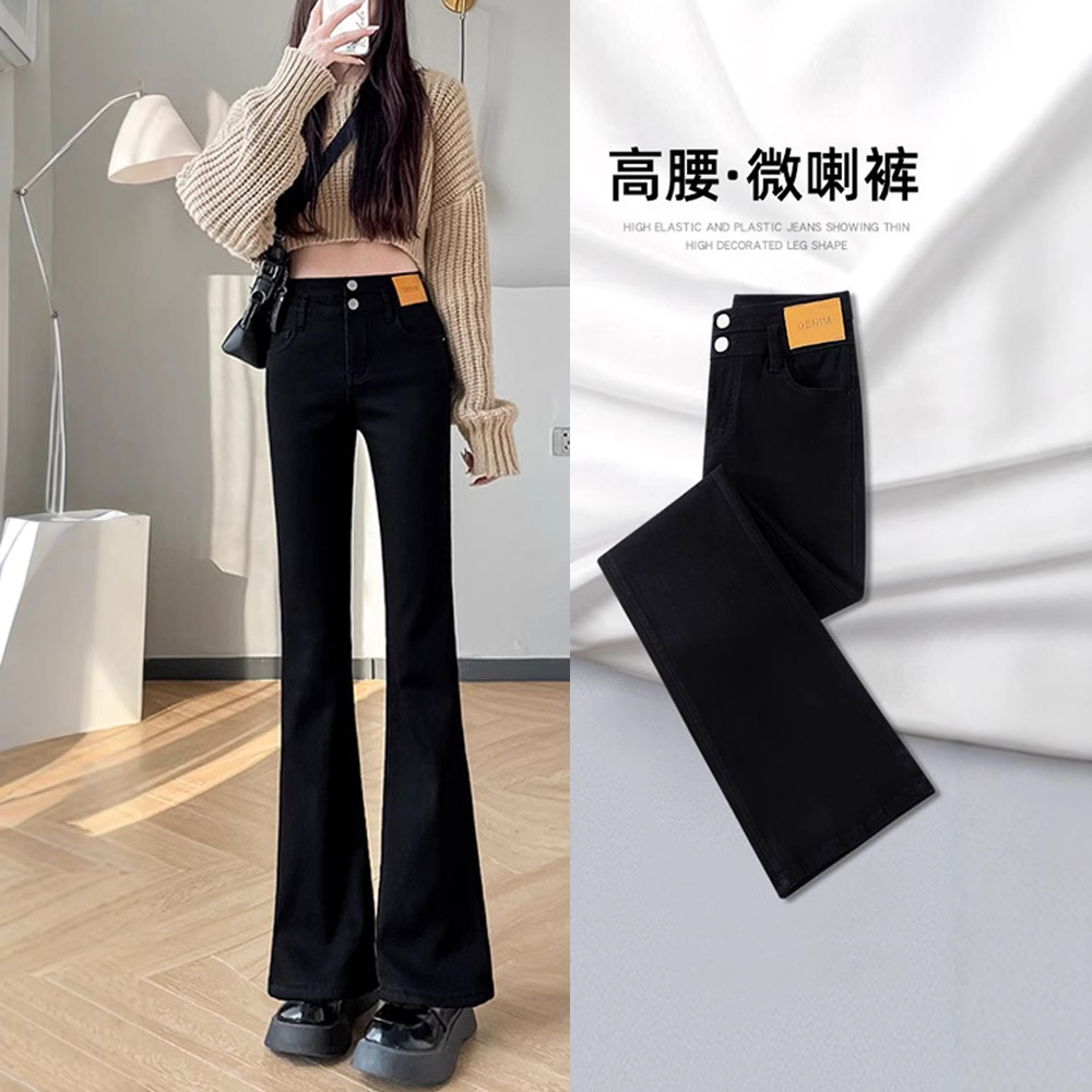 黒いラッパのズボンの女性の春夏2025年の新型のデザイン感が高くて、腰が高くて痩せています。