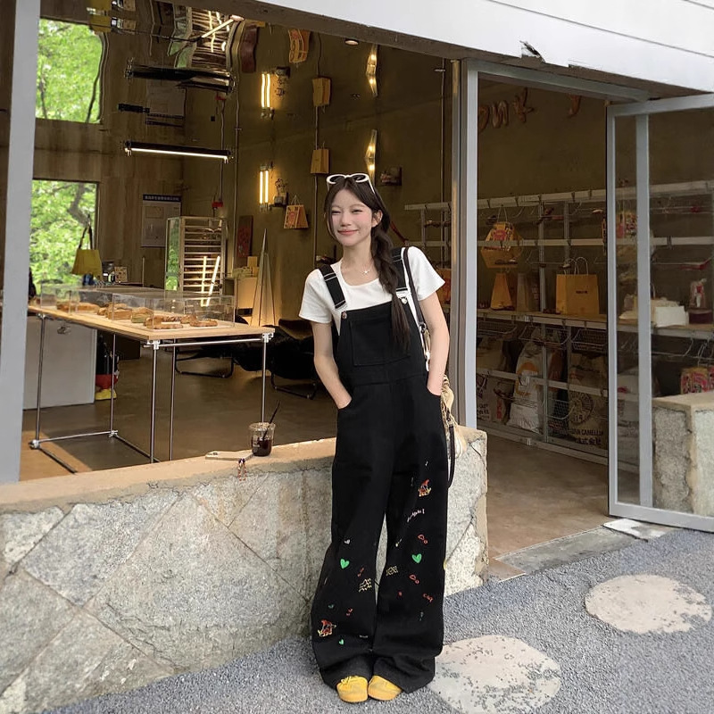 2025 春の新漫画刺繍黒年齢軽減デニムオーバーオール女性のハイウエストルーズストレートフロアレングスパンツ