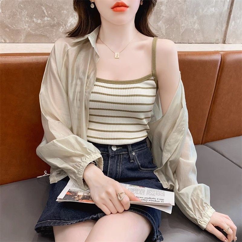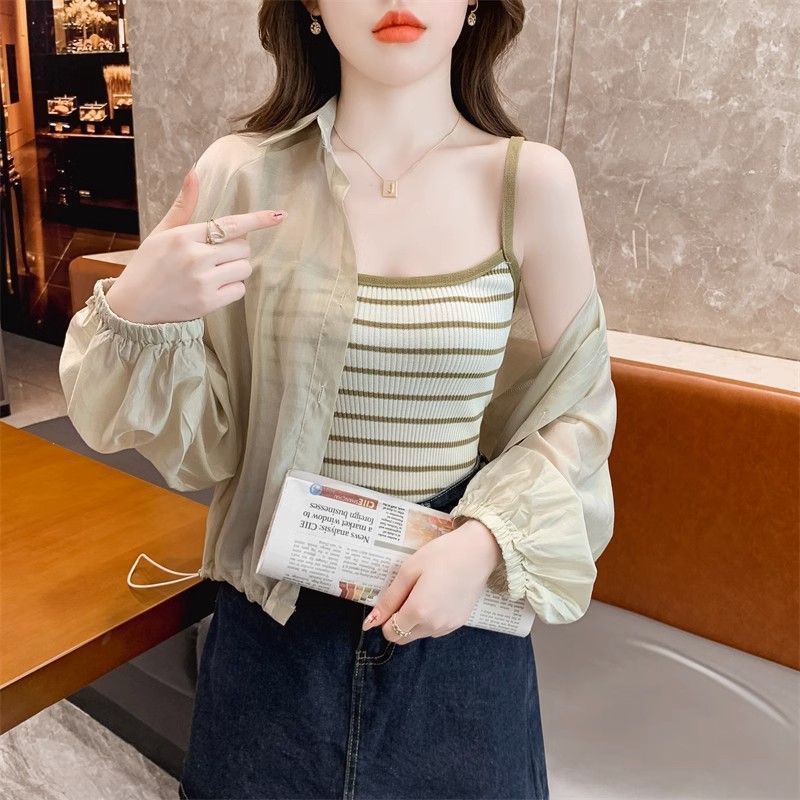 小柄で薄っぺらな日焼け止め服の女性は夏2025年に新型のショートシャツの長袖の外にカーディガンのコートを着て潮が満ちています。