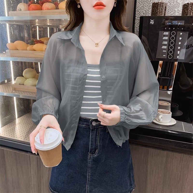高級感のある灰色の氷糸の日焼け止め服の女性の夏の薄いコートの垂れ下がった感じの長袖の外はブラウスのシフォンのシャツの潮を掛けます。