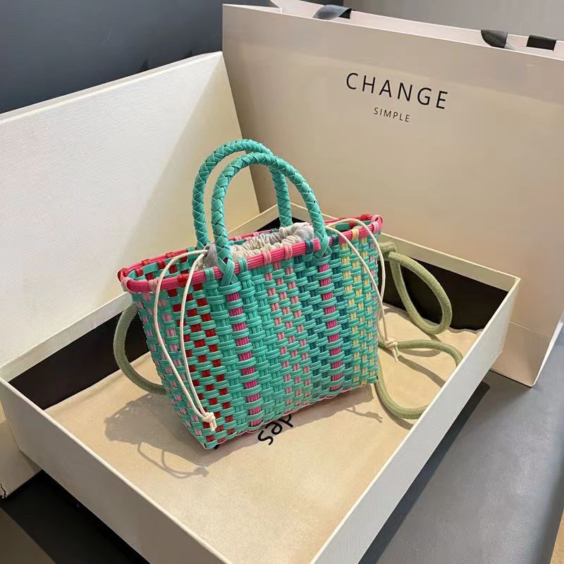 カラフルな籐編み水桶バッグ レディースバッグ 小型草編みバッグ 手提げ野菜かごバッグ 斜め掛け編みポータブルバッグ