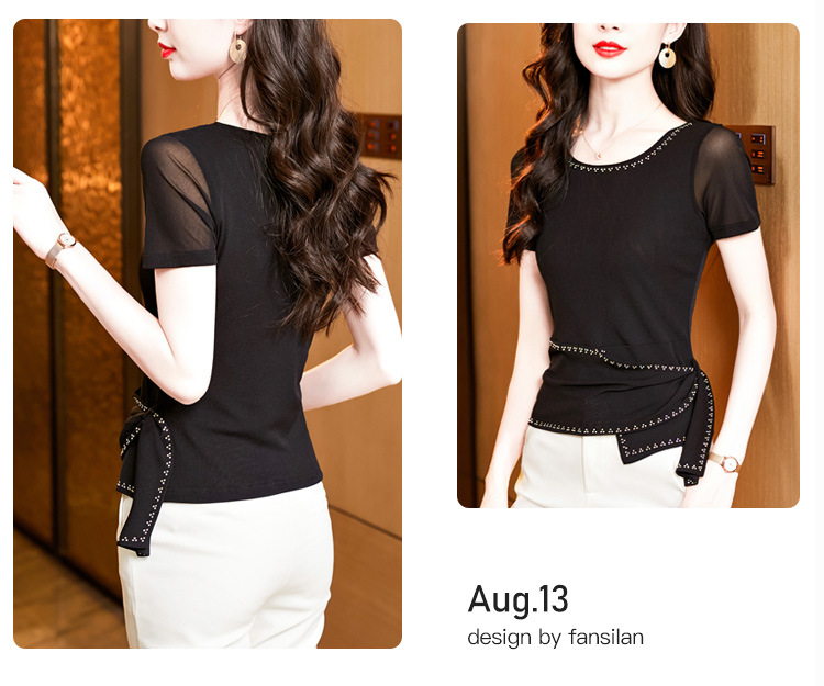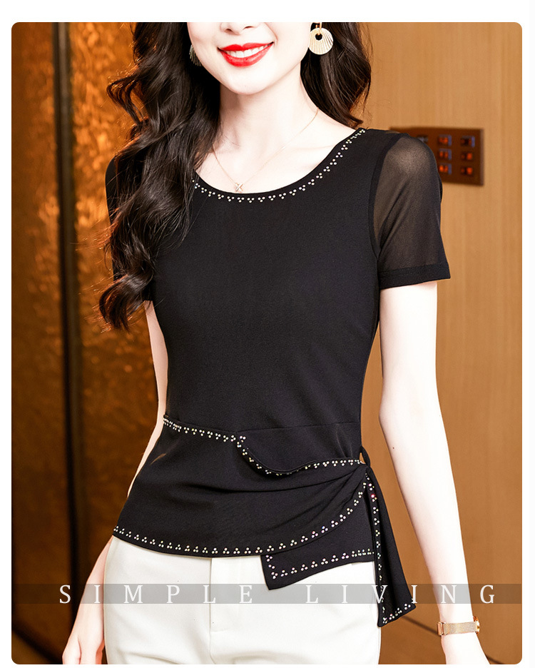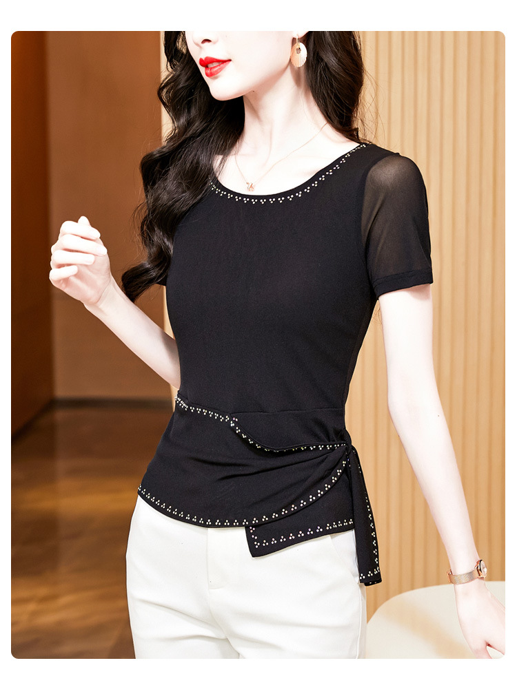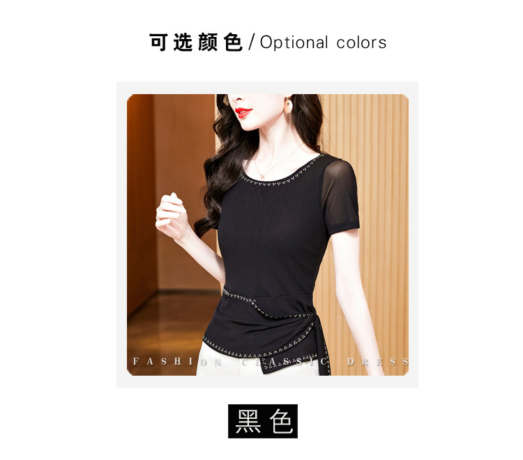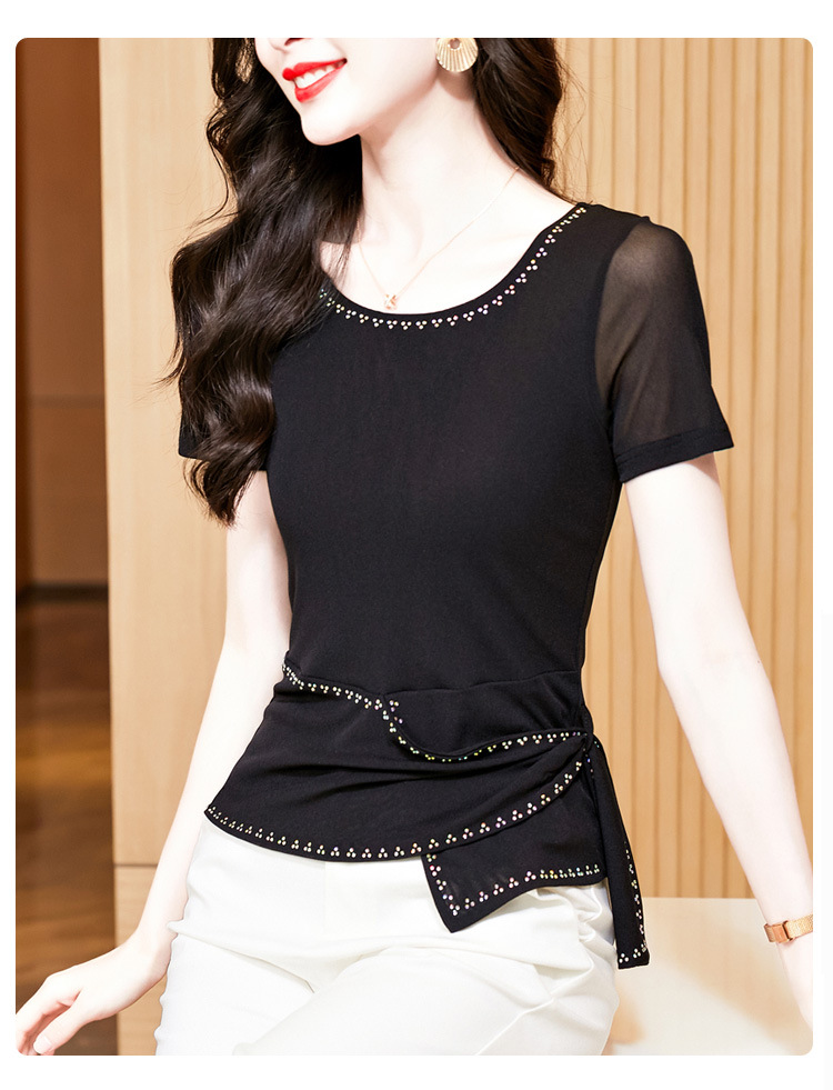 ラウンドネックメッシュ半袖Tシャツレディース夏新作不規則ホットダイヤモンドボトムシャツ多用途外国風ダンスウェアトップ
