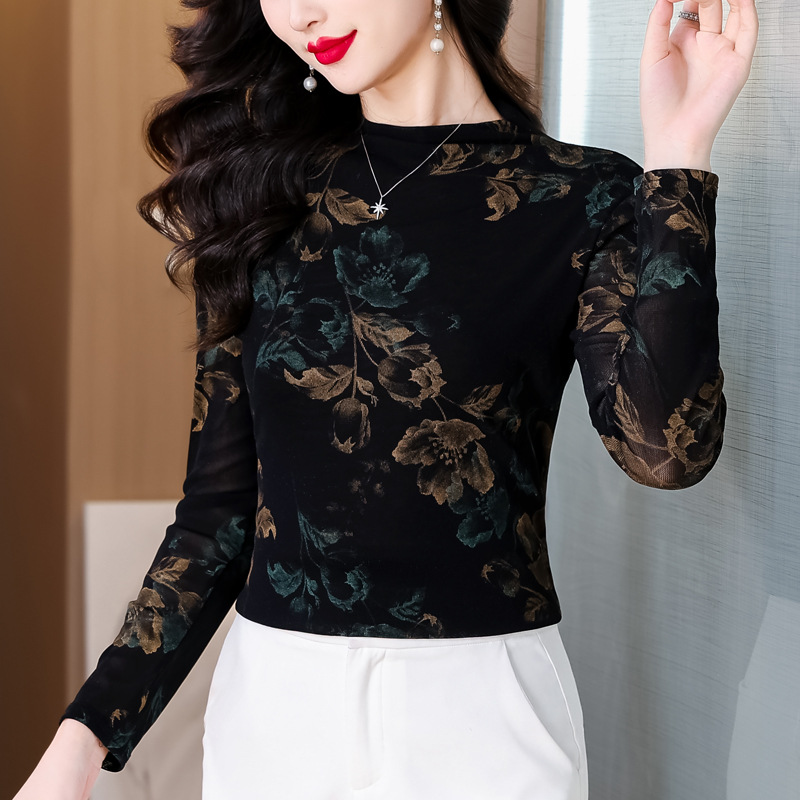 レトロなプリントの半透の高い襟の底のシャツの女性の2024春秋は長袖のtシャツの網の糸のレースの上着を修理します。
