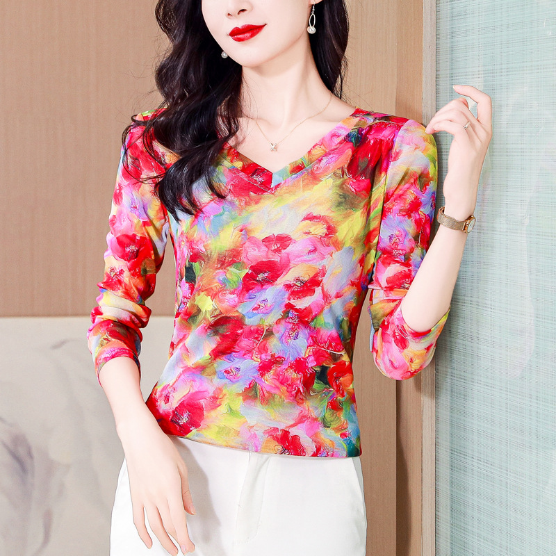 圆领网纱打底衫女士内搭春秋新款洋气印花长袖t恤妈妈装修身上衣