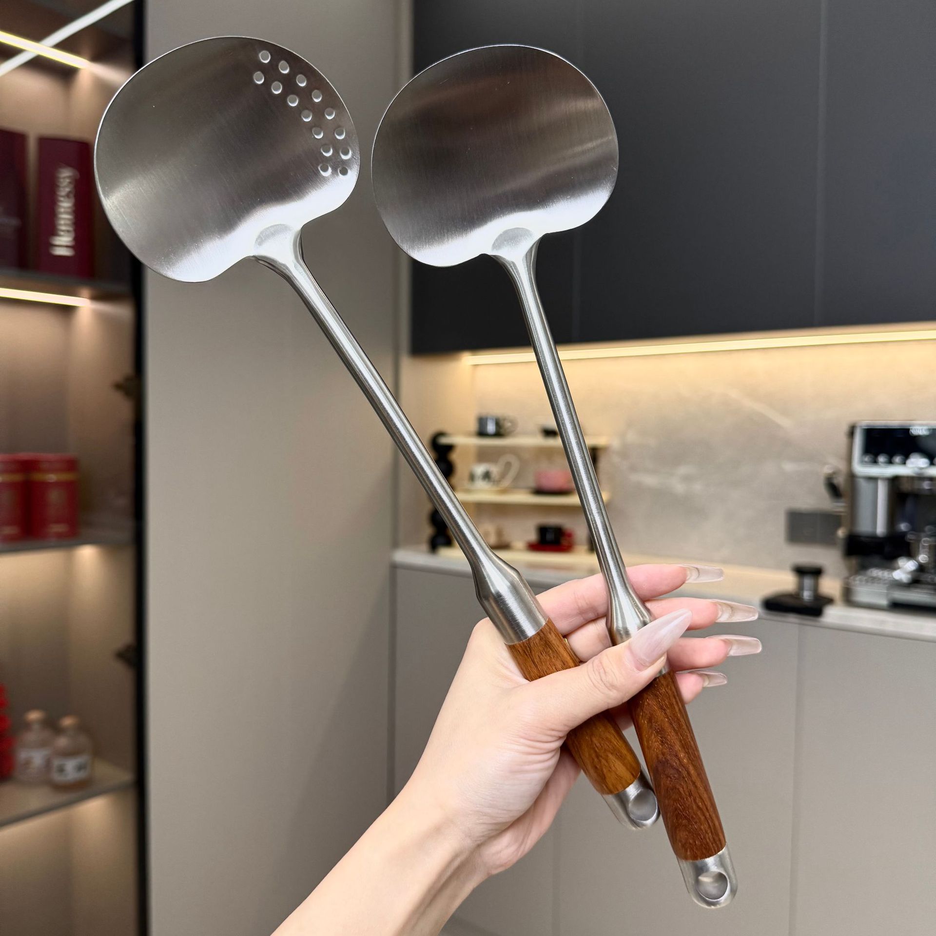 304ステンレス製の炒め物用スプーン、家庭用シェフ用鍋つかみ、料理用スプーン、長柄の花梨木製ハンドル付きスープスプーン、ザル、揚げ物用スプーン