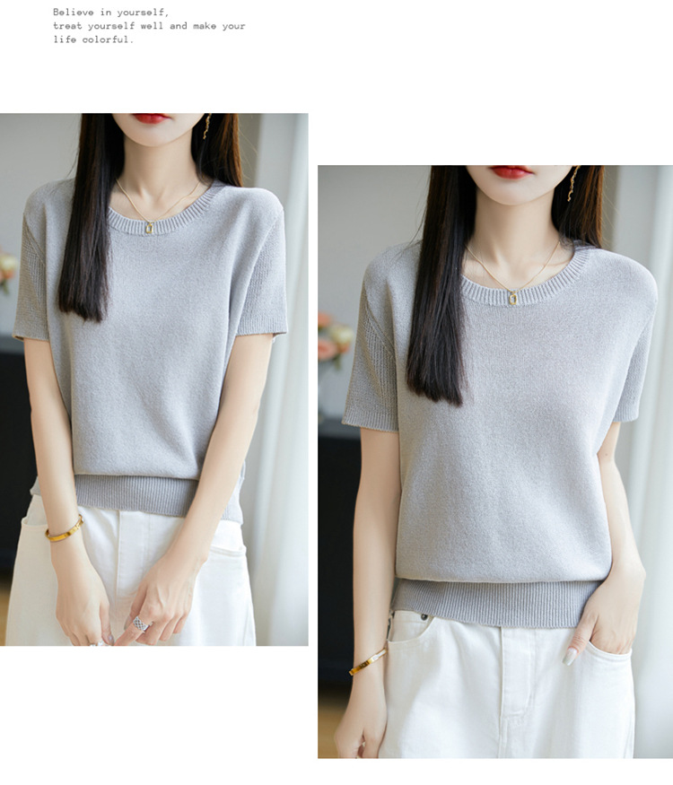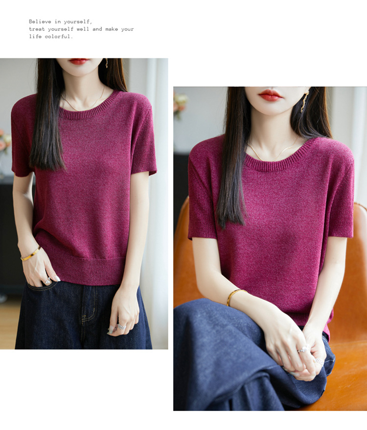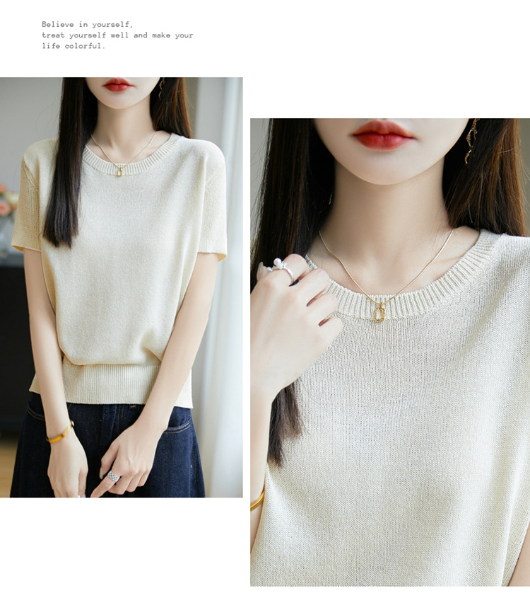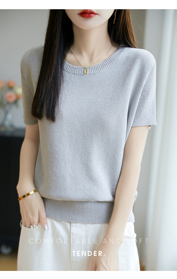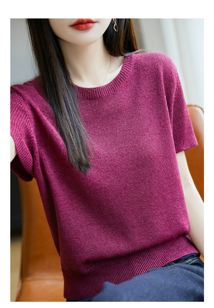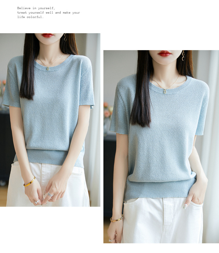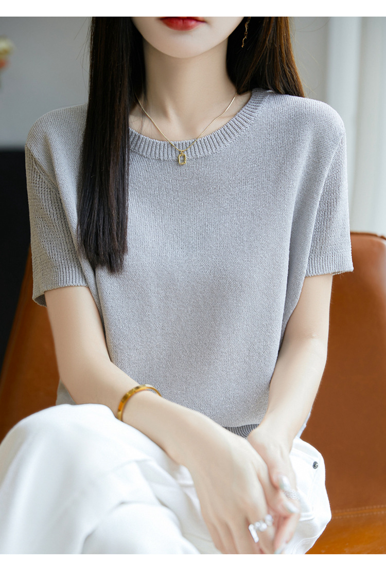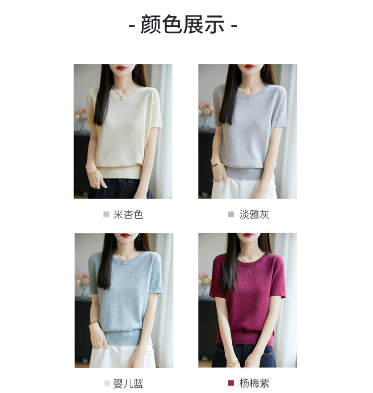 2025年夏の新型丸襟ニット半袖tシャツ女性の薄いタイプの天糸の底のシャツのゆったりした半袖の上着のファッション