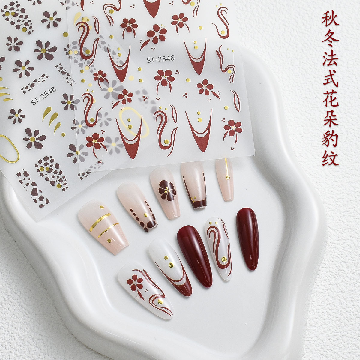 小红书网红爆款复古甜美风鎏金秋冬法式花朵豹纹烫金指甲贴纸饰品