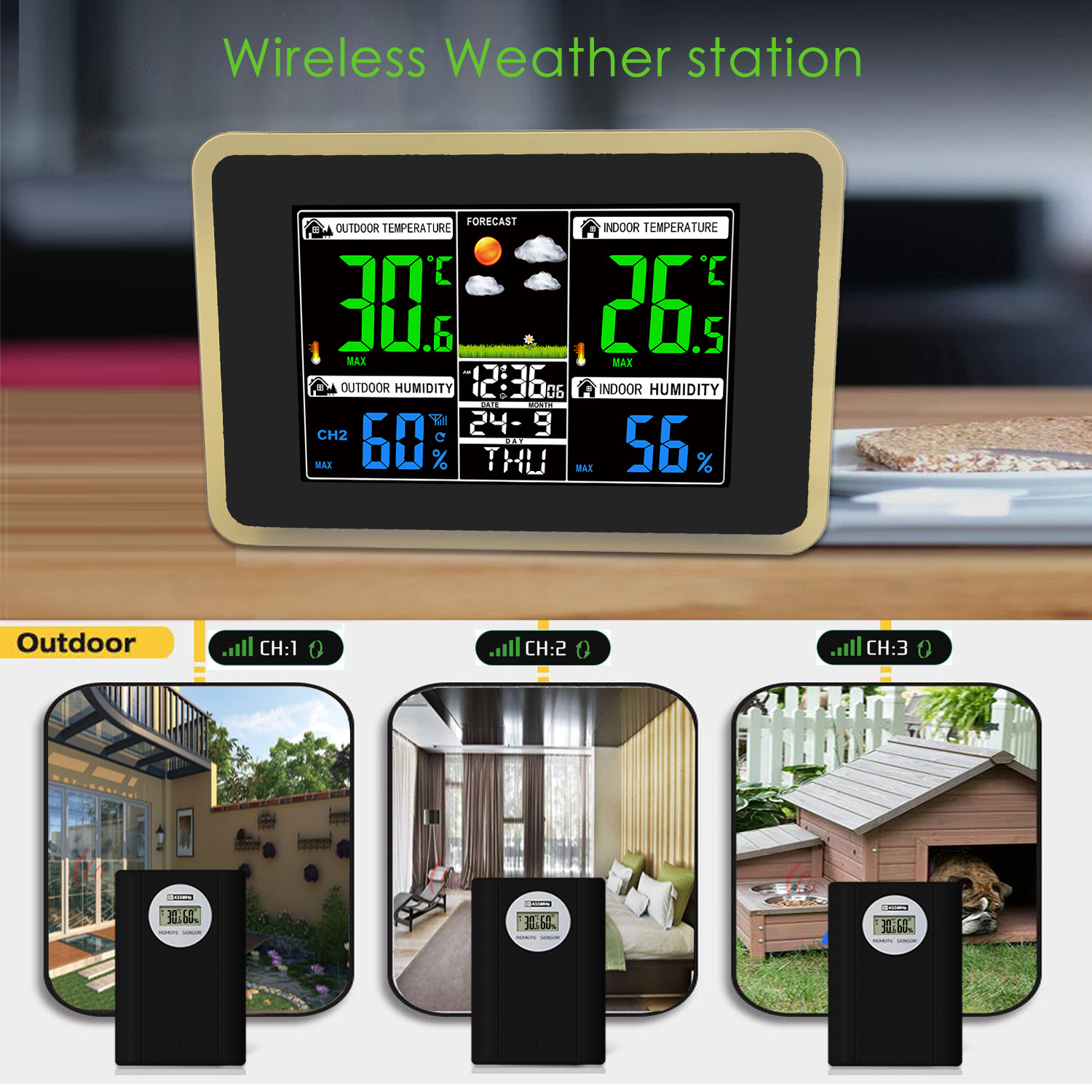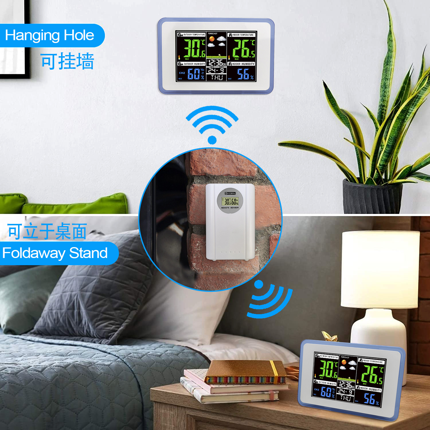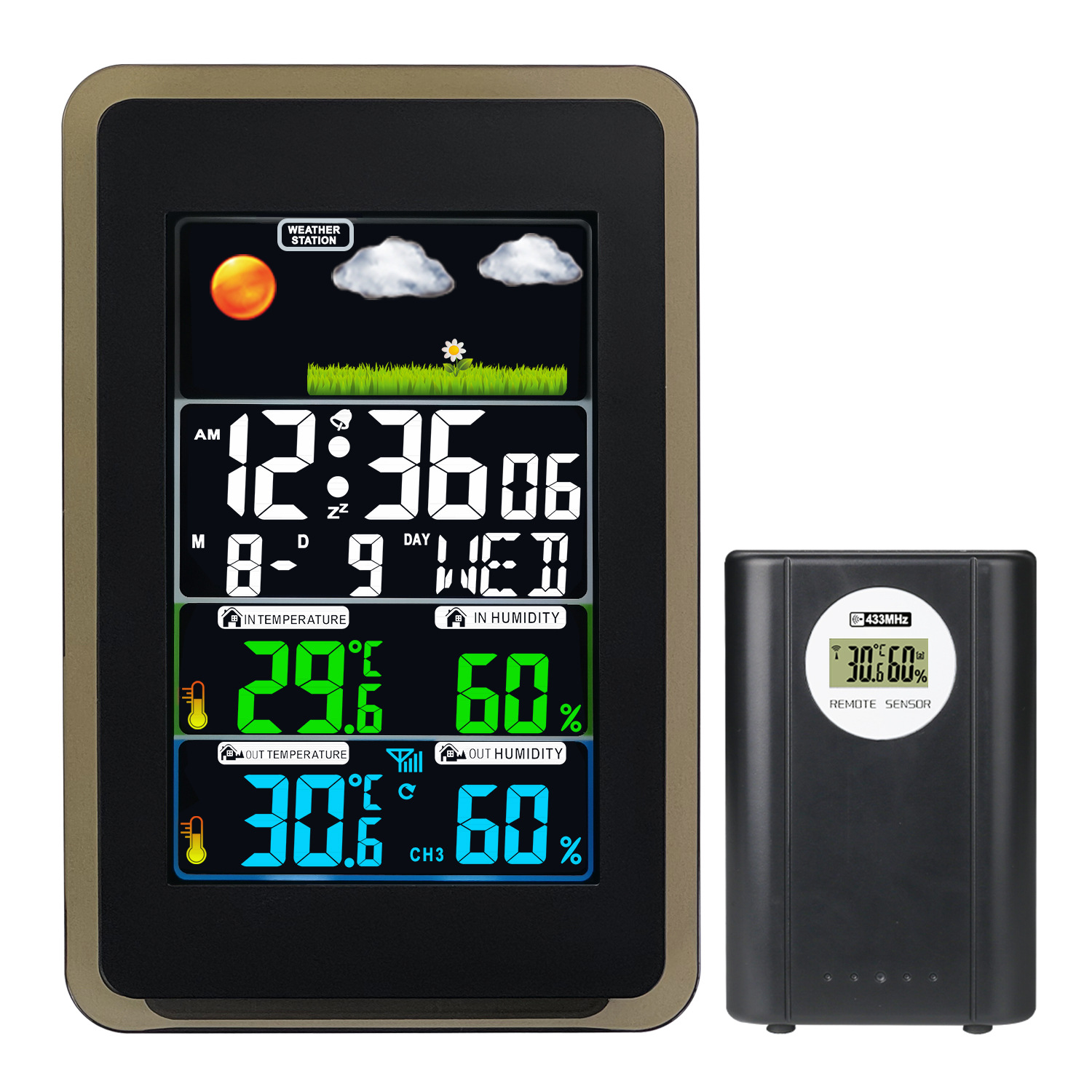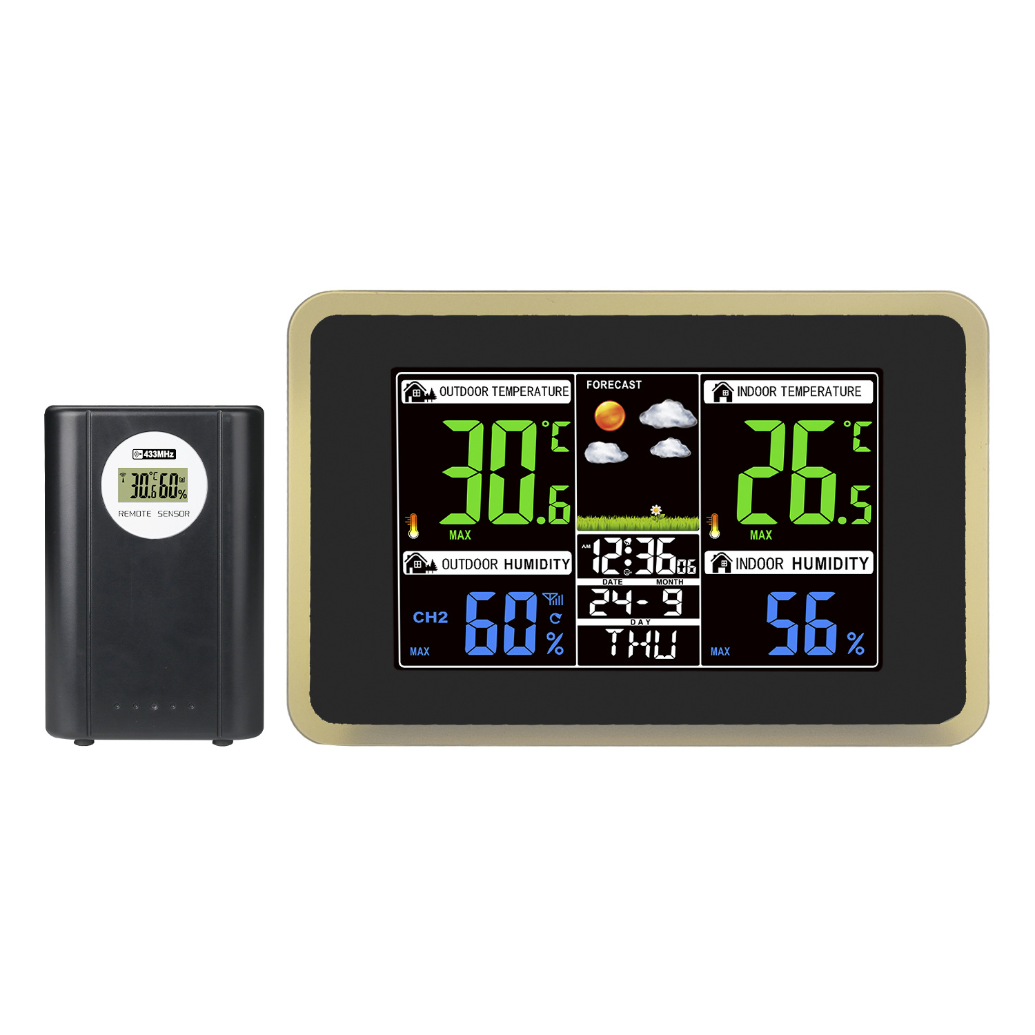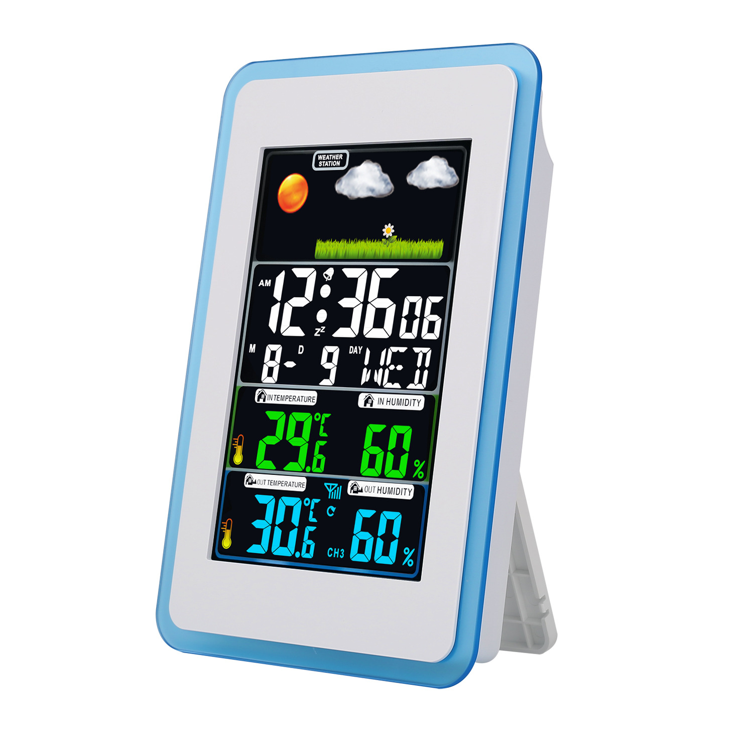 クロスボーダー熱売無線伝送カラーディスプレイ天気予報鐘室内外温湿度気象監視目覚まし時計