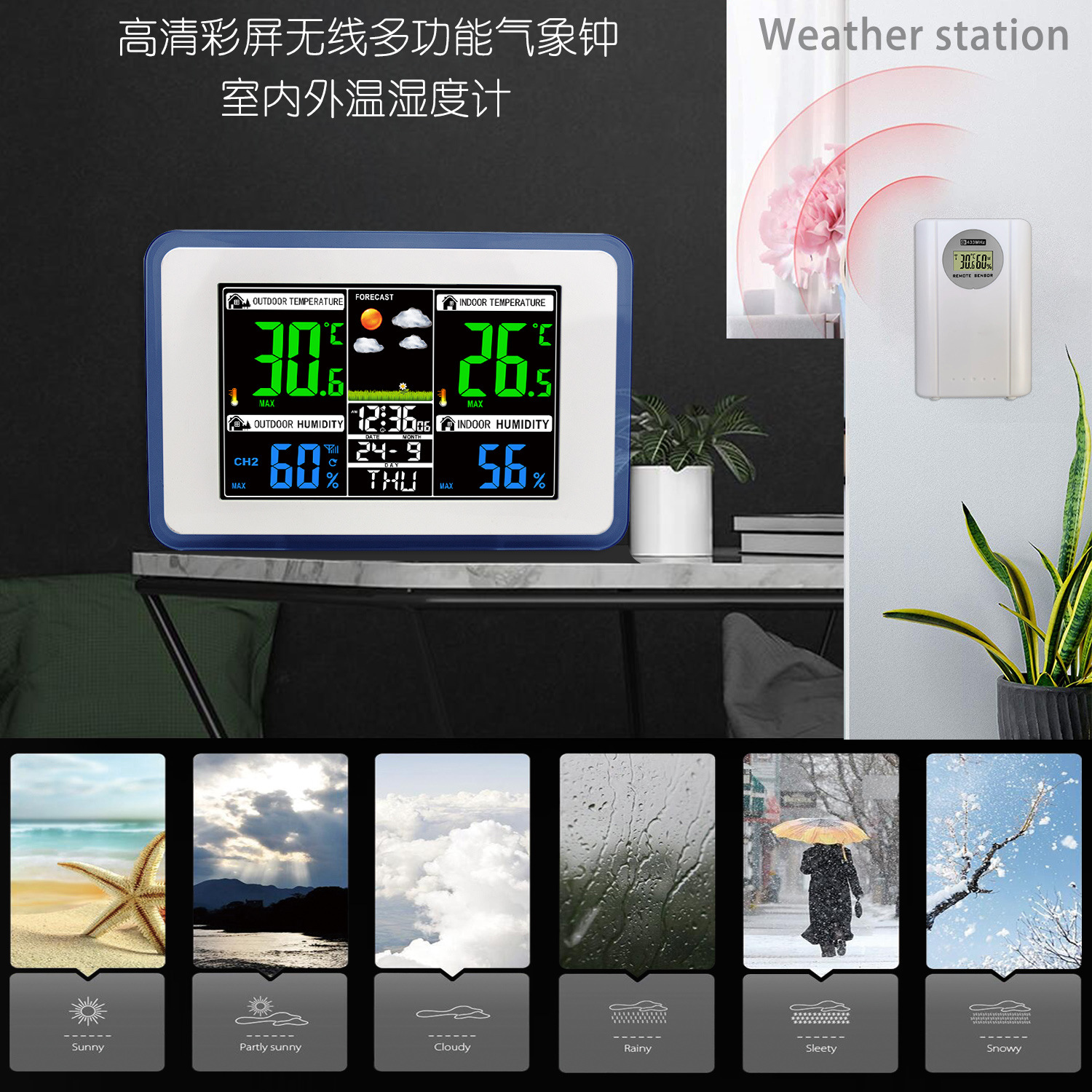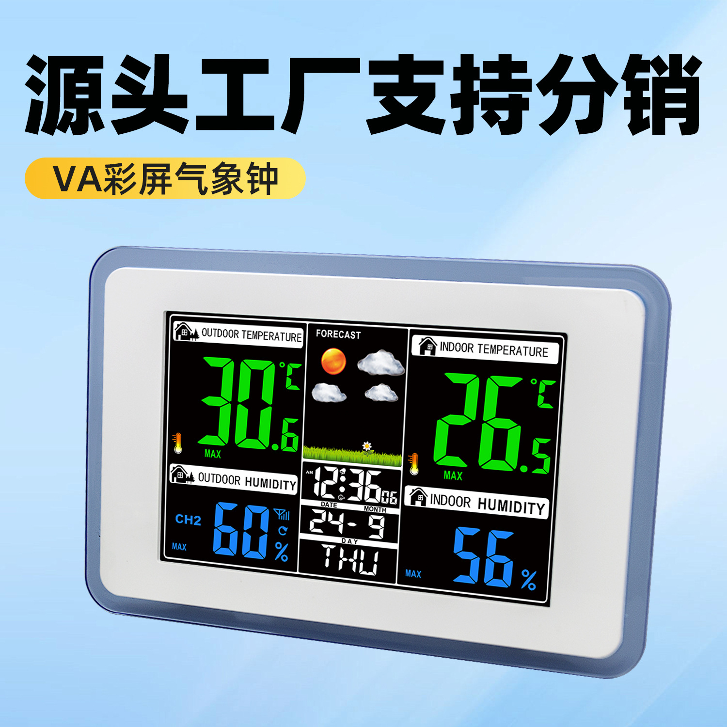 跨境亚马逊热卖彩色天气预报钟VA工艺室内室外温湿度气象监测闹钟