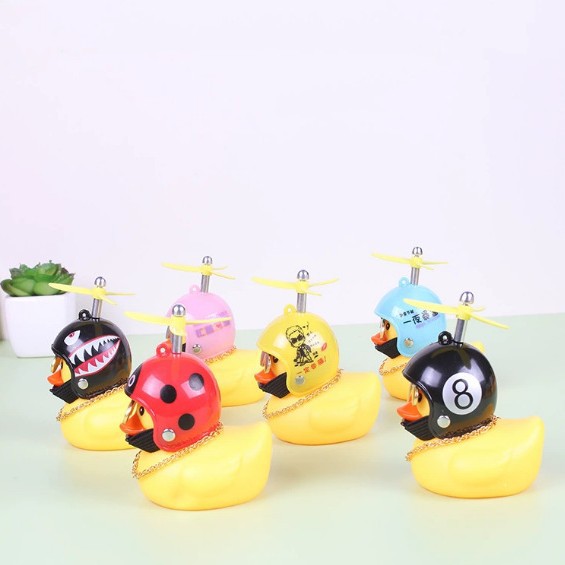 自転車の小さい黄色のアヒルの部品の自動車の車の上で部品の破風のアヒルのネットの赤い震える音のアヒルのヘルメットのサングラスのネックレスを並べます。