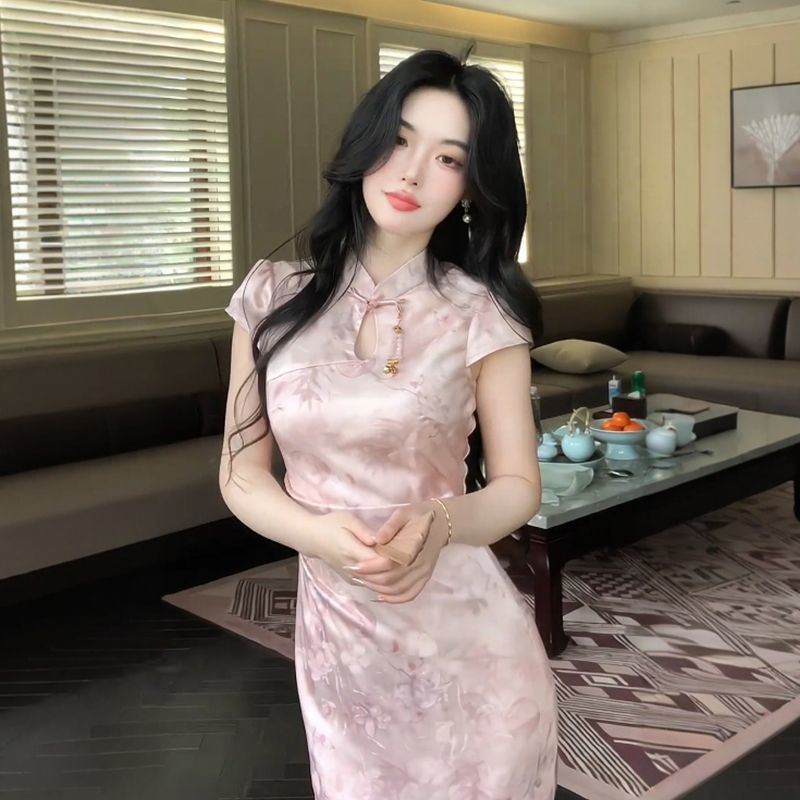 新中国風ピンクのチャイナドレスのワンピース女性は夏2025年に新型の気質が腰を収めて痩せています。