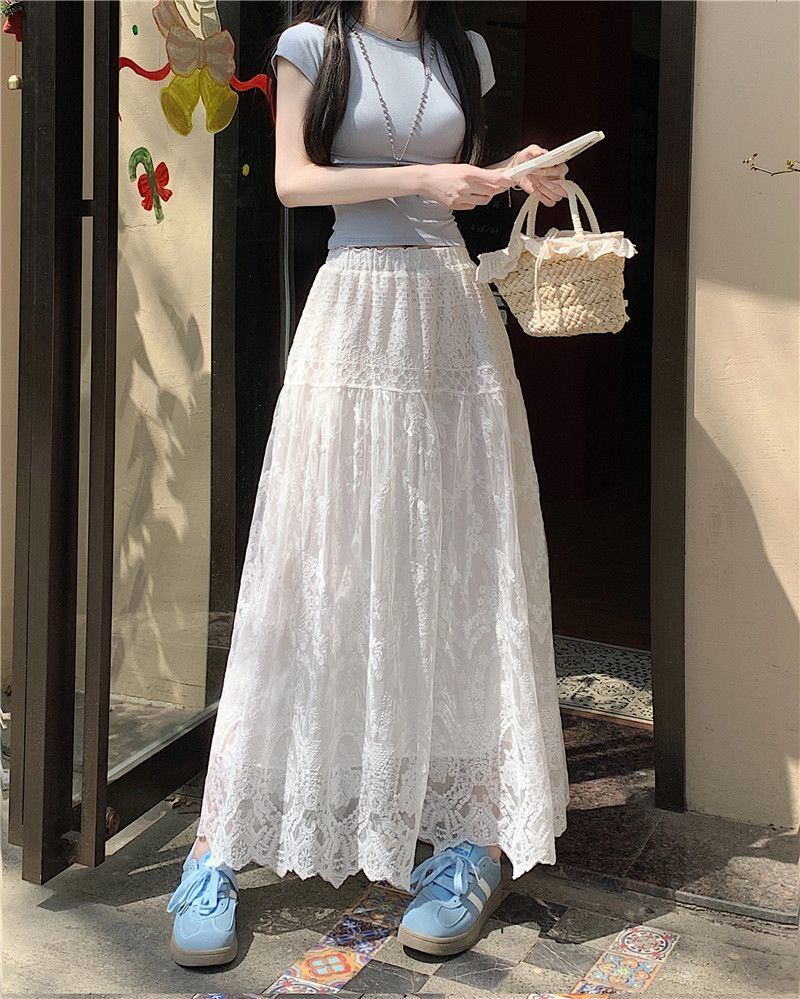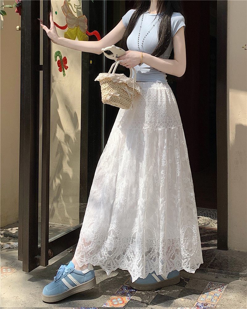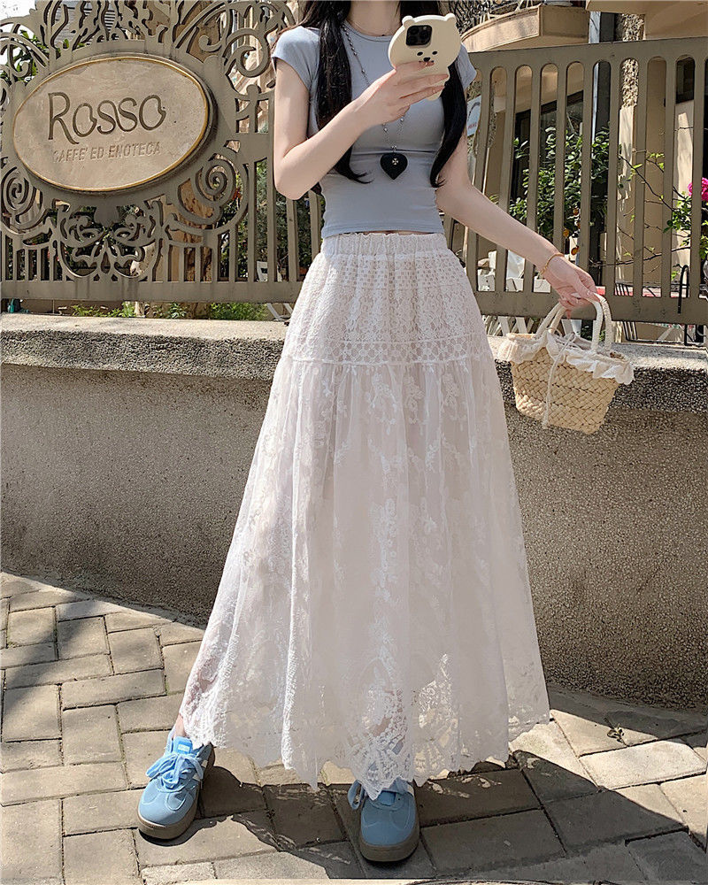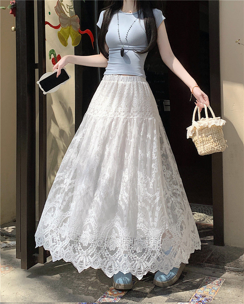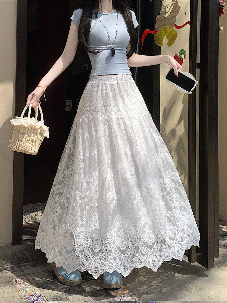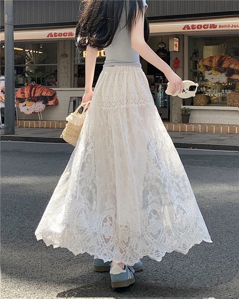 フランスのヘビーデューティーレース中空フックパターンスカート女性のための春ハイウエストスリムスカートミドル丈Aラインスカート381G