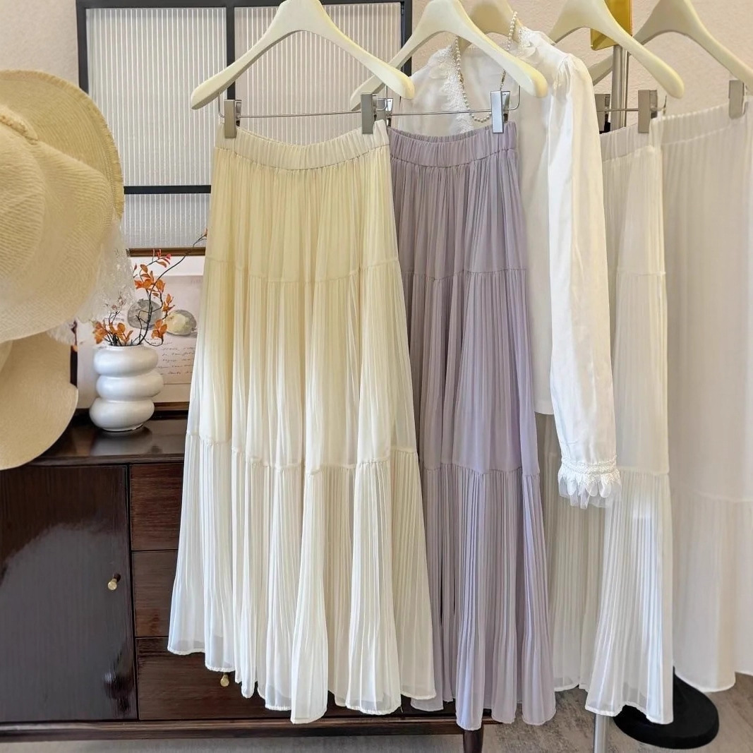 女性用フォレストホワイトスカート2025春夏新作ハイウエストAラインスリムミドル丈プリーツ気質ロングスカート