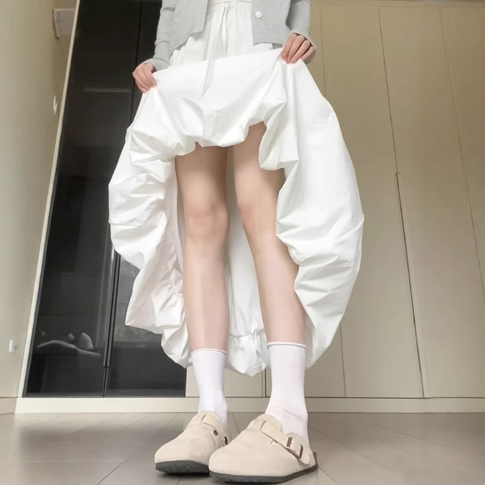 女性用白いつぼみスカート、夏の薄いアイスシルククラウドスカート、ミドル丈のハイウエストスリムAラインパフスカート