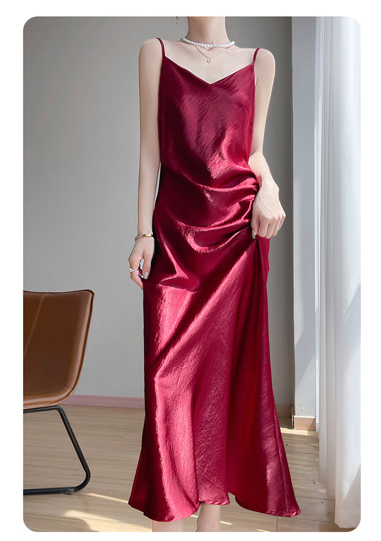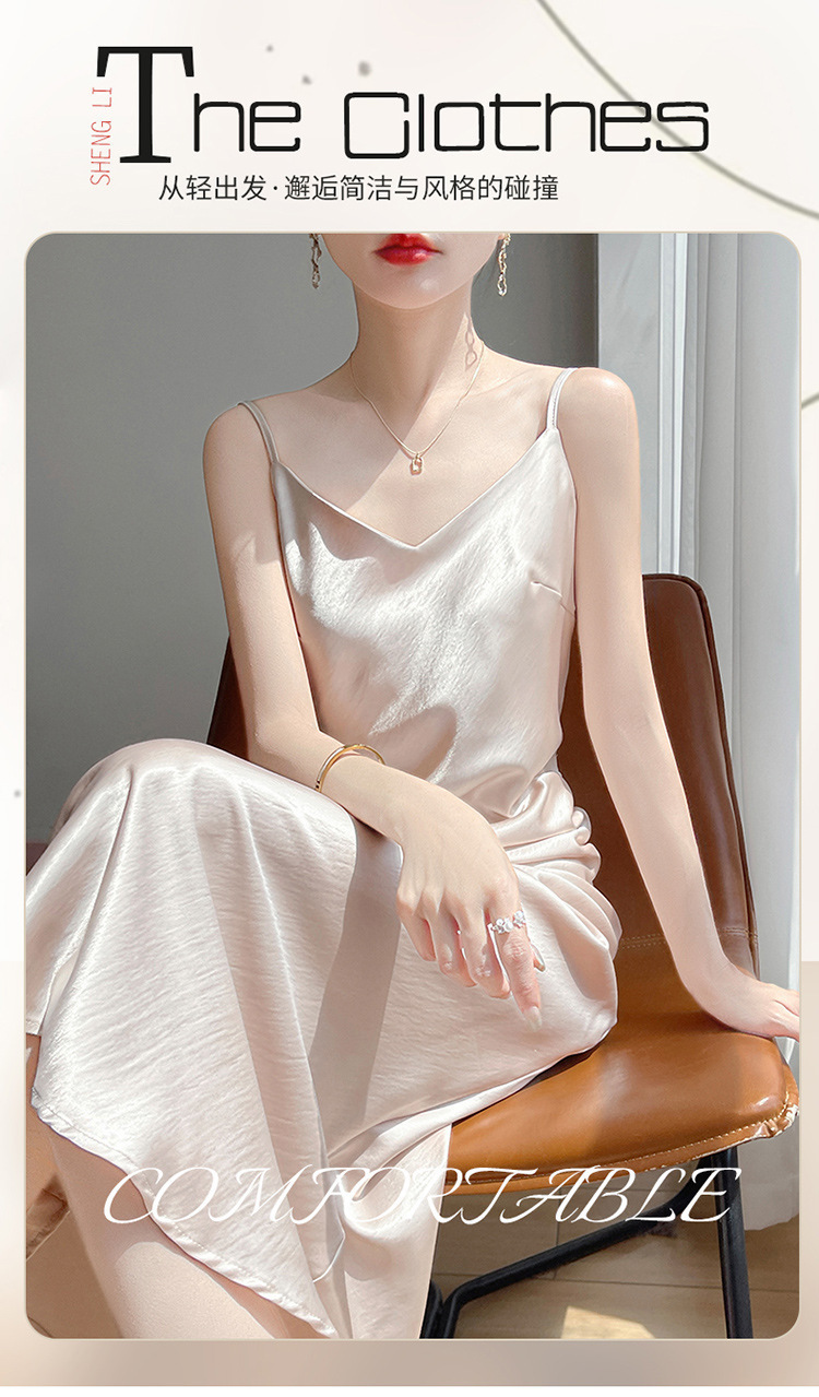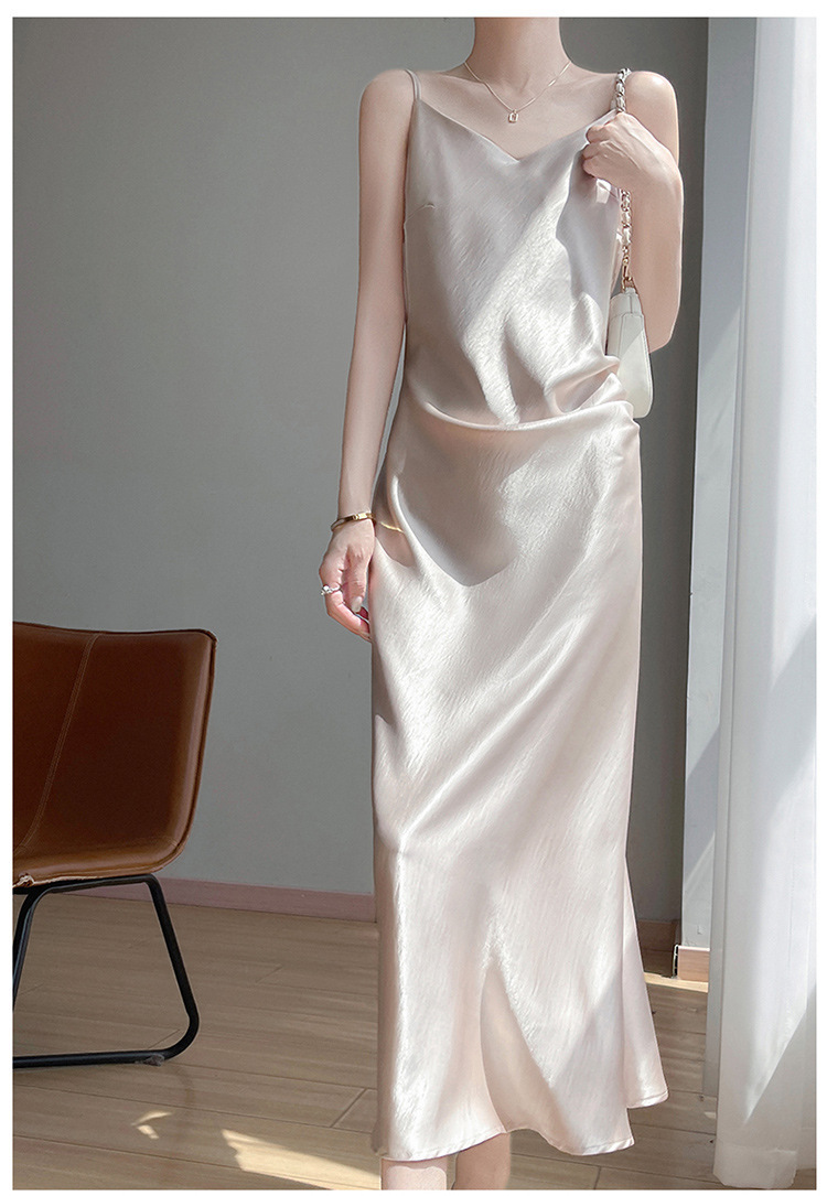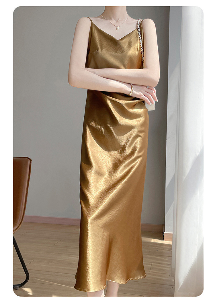 夏の新しいスタイルの金メッキサテンレディースVネックサスペンダードレスニットノースリーブプリーツデザインスリムロングスカート