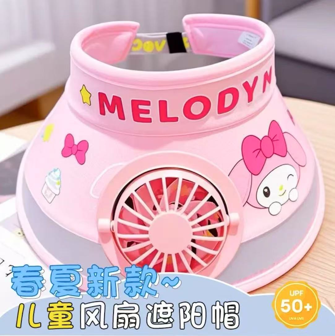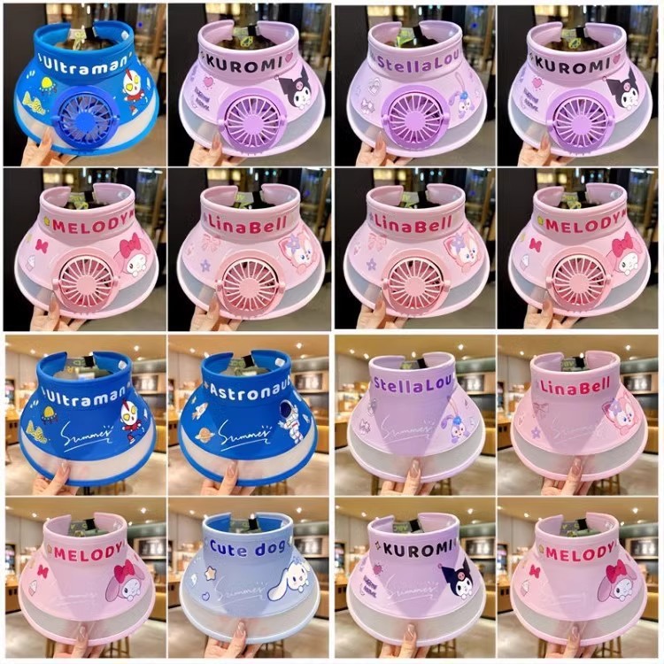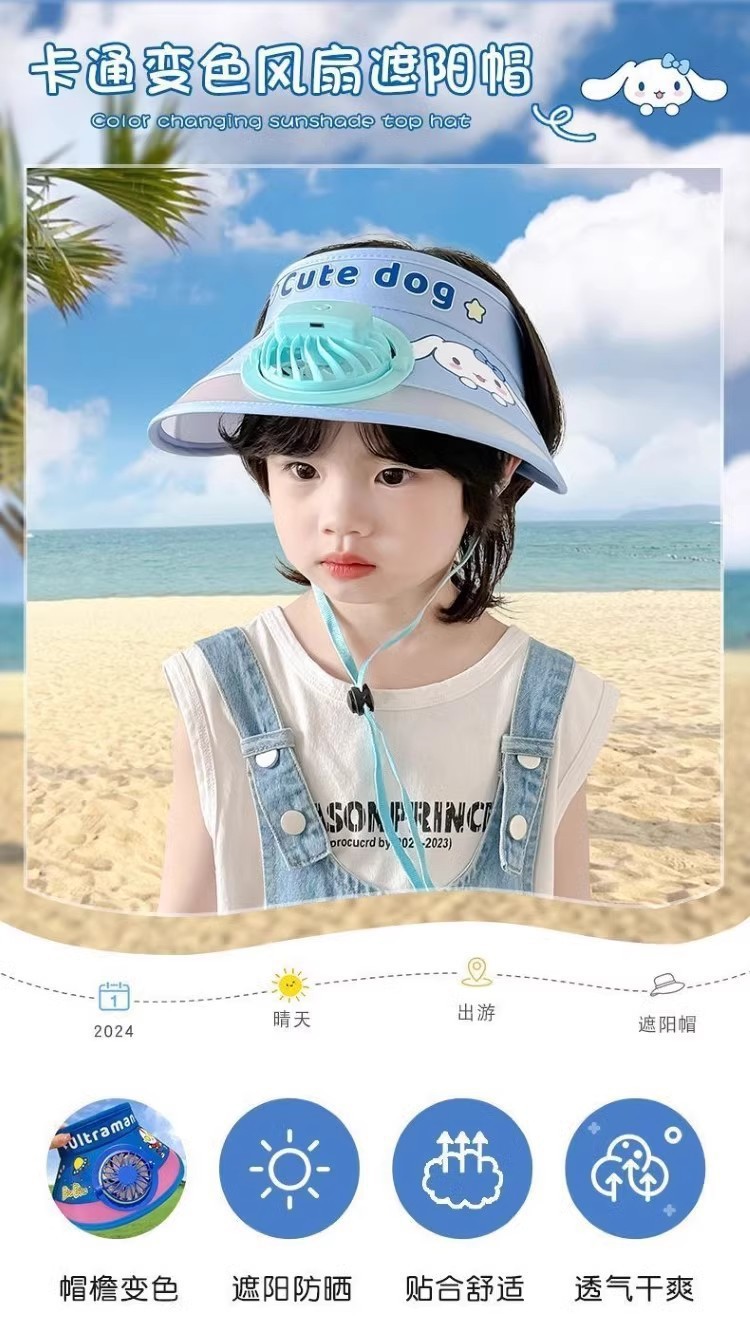 夏の子供用帽子、かわいい漫画のサンハット、男の子と女の子の日焼け止め、紫外線対策、空頂サンハット、ファン付き