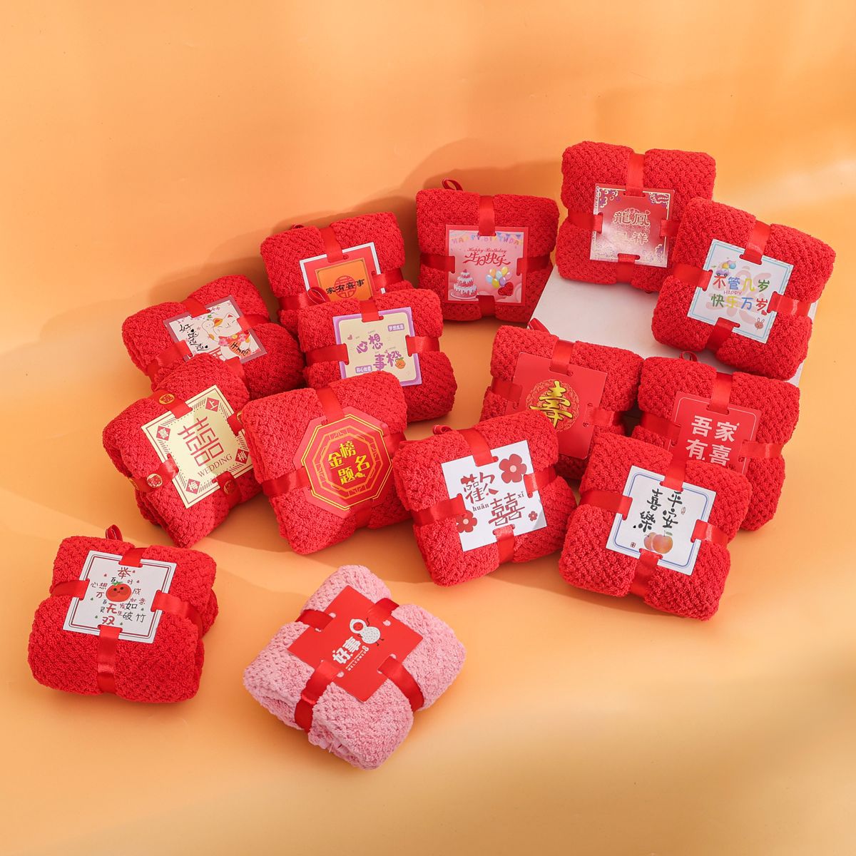 刺繍タッセル付きコーラルベルベットタオルギフトボックス、ダブルタオル、結婚式の引き出物、お返し、高級中国風大判タオル