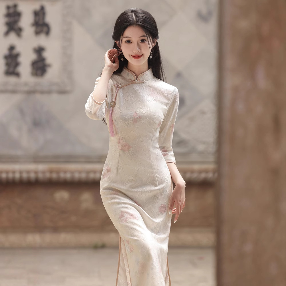 白の逆大袖長袖チャイナドレス秋冬日常改良民国大お嬢さんの絶美気質高級感